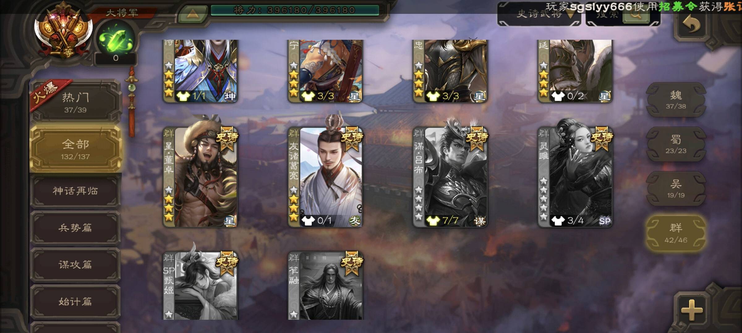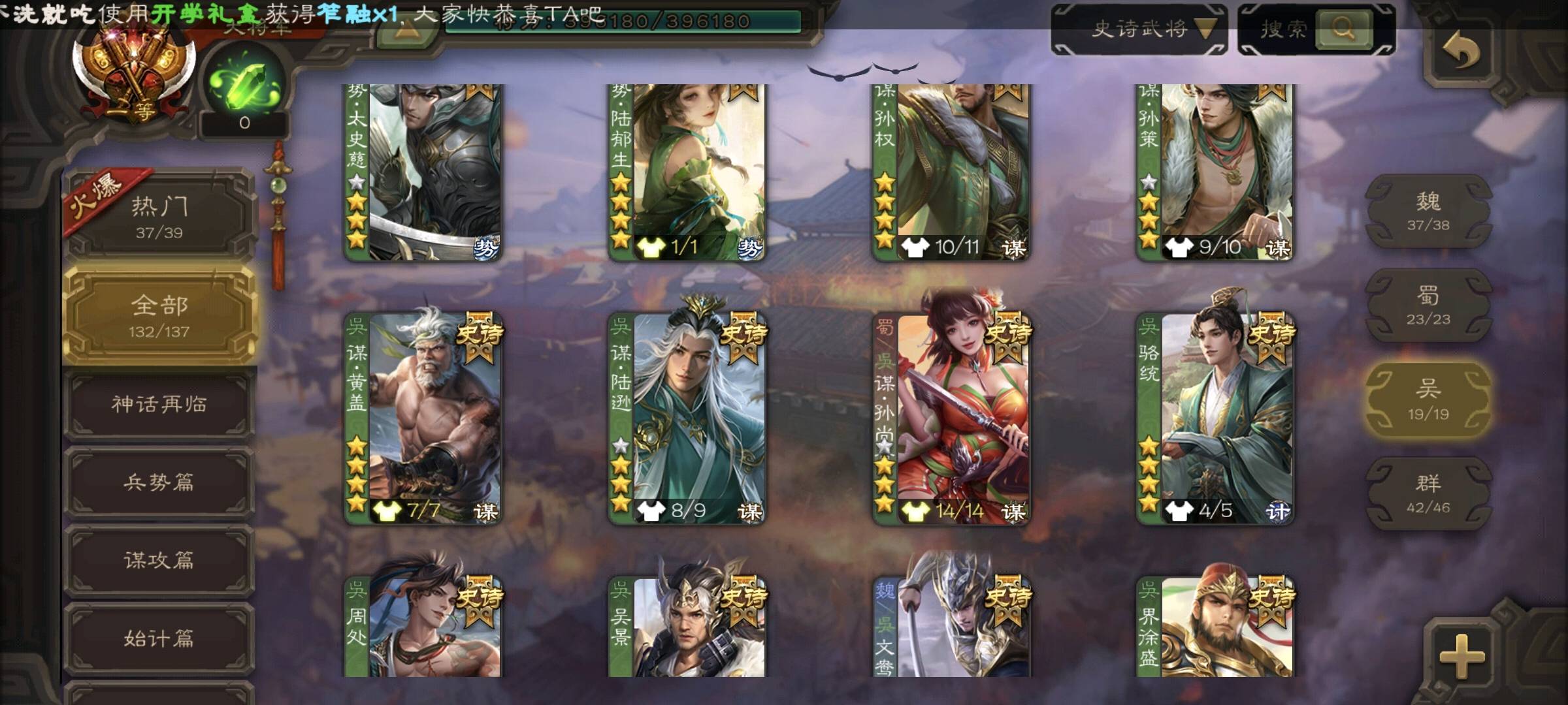 群——左慈,许攸,谋貂蝉,杜预,刘璋,界左慈,沮授,界李儒,张让,麹义,陶谦,士燮,司马徽,卑弥呼,刘焉,王允,苏飞,公孙康,兀突骨,祢衡,庞德公,郑玄,星甘宁,张仲景,黄甫嵩,界沮授,审配,徐荣,陈登,张琪瑛,灵雎,杨彪,裴秀,十常侍,星黄忠,星魏延,谋公孙瓒,星董卓,势于吉