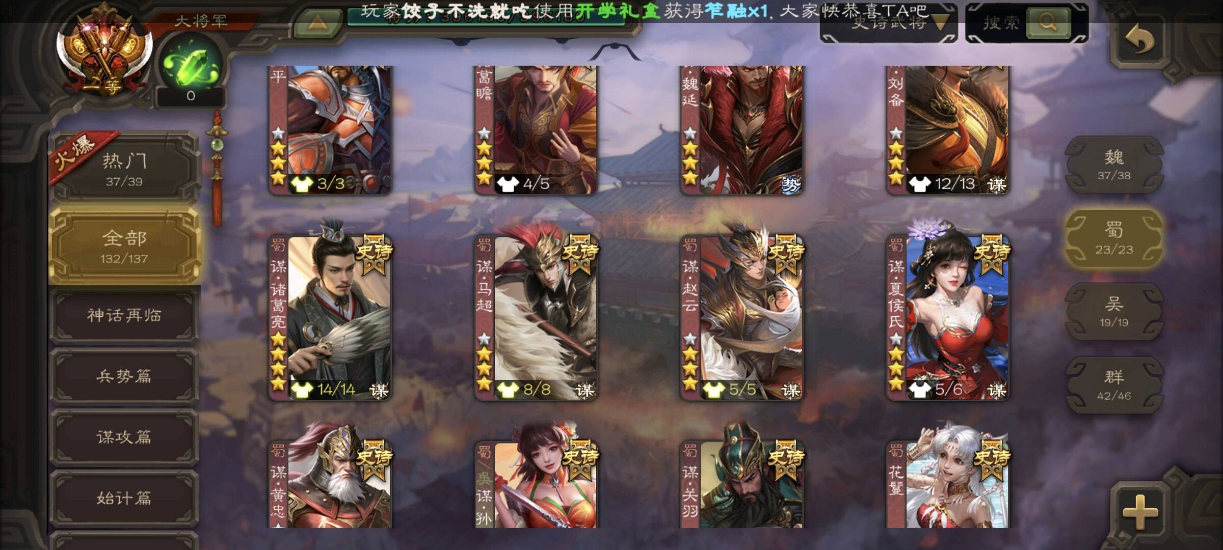 蜀——王平,诸葛瞻,谋马超,谋赵云,谋夏侯氏,花鬘,界黄忠,马云騄,张星彩,董允,赵襄,关索,沙摩柯,周群,谯周,谋刘备,某黄忠,谋孙尚香,鲍三娘,傅佥,谋诸葛亮,谋关羽,势魏延