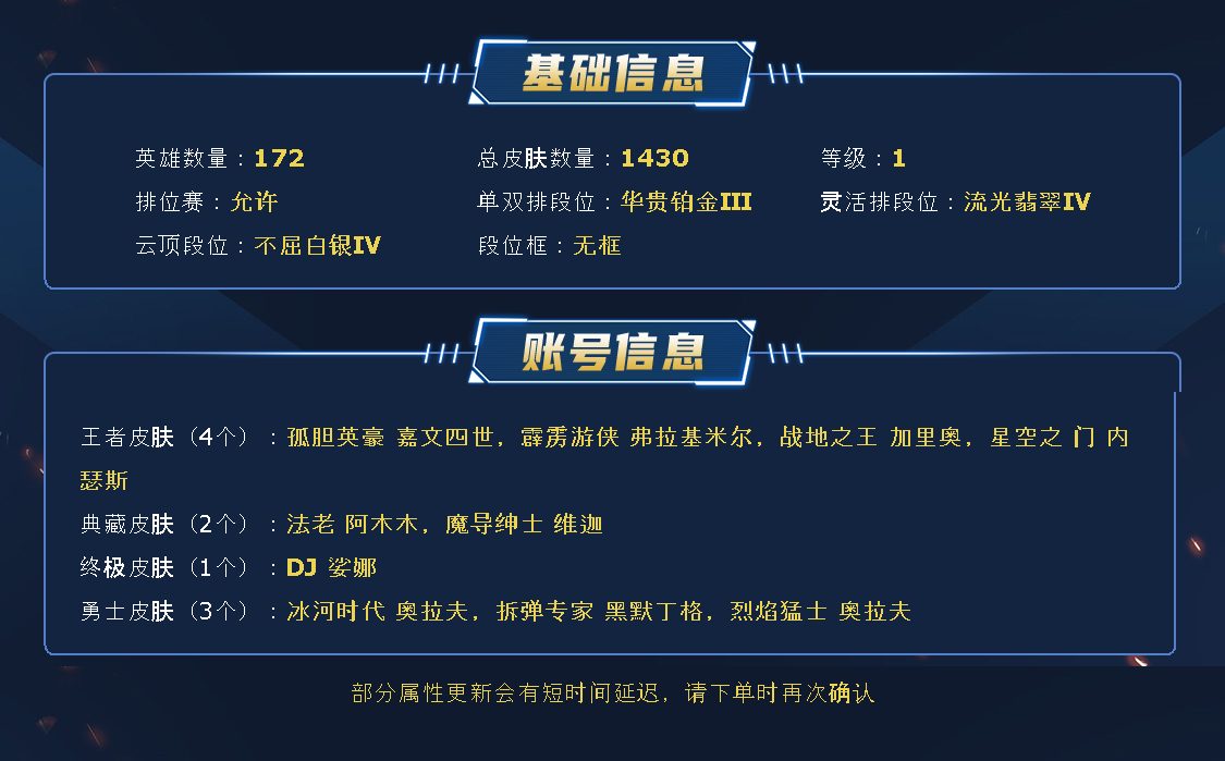 ~~喜欢记得收藏~~可排位~~1400皮全英雄~~租之前尽量查一下游戏ID,确保段位是您需要的,避免浪费您的时间~~请勿挂机逃跑故意送人头,谢谢合作,谢谢~~