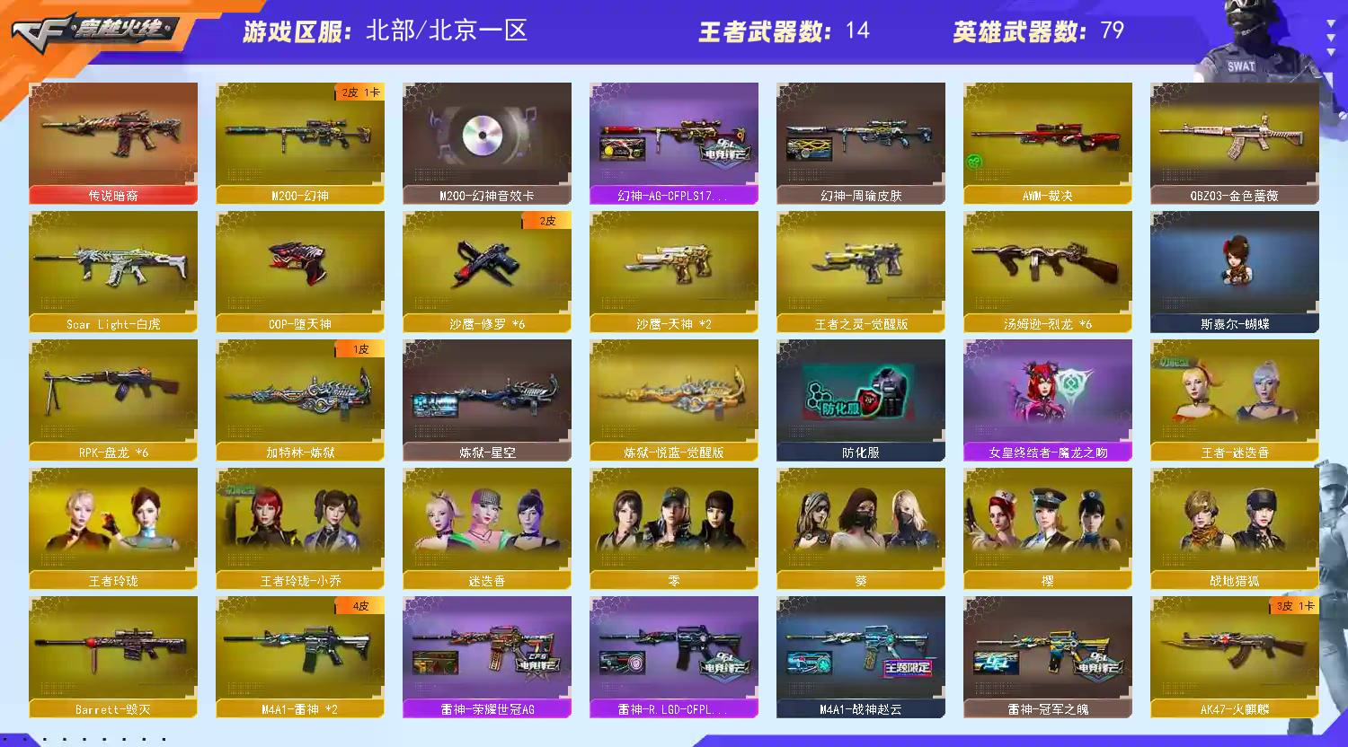【其他重要武器】炫金超新星/炫金雷神/炫金骑士/激光毁灭者III(3)/M4A1-电音/M14EBR-炎龙(2)/AK-47-红龙/XM8-炫彩/M4A1-Guitar 炫彩/M4A1-樱/M4A1-秘银赤龙/AK47-齐天大圣/AK47-枪娘(2)/M4A1-XS-赤龙/AK47-破空冰刃/M4A1枪王排位II/AK47-大帝林肯/QBZ03-吕布/AK47-万圣节2021/AK47-QT(2)/AK47-B-十周年/AK-103-火线13周年/黄金AK-47/Barrett-炎龙/AWM-恶棍-枪王排位/AWM-Red/M200-青帝/AWM-枪娘(2)/Barrett-孔明(2)/AWM-摸金校尉/AWM-A枪王排位II/M200-大黄蜂(3)/98K-蓝色骑士/Barrett-黑大圣/Barrett-怒火大圣(2)/Barrett-牛魔王/AWM-卡通/M200-赤血龙魂/破天狂龙/KAC-圣炎切割者III/雷蛇加特林/KAC-小动物/M240B-卡通/KAC-赤烛/致命乱世-超越Max/EVOⅢ-黑金传说(2)/斯泰尔-巧克力/EVOIII-萌杀/斯太尔-能量核心/神圣爆裂者/Spas-12-黑金/SPAS-12-雷电核心/修罗-年鹏(2)/阐释者III/Anaconda-炽焰核心/新USP-枪王排位奖励/幻影Anaconda-枪王排位/COP-金蝉子-枪王排位/沙漠之鹰-炎龙/愤怒公牛左轮-枪王排位(2)/Anaconda-雷电核心/新USP-怒火大圣(2)/收割者-枪王排位/虹光丛林匕首-枪王排位/尼泊尔-炎龙/啸天/魔能镰刀/幻影双斧-枪王排位/尼泊尔军刀-战龙/斩魔刀-怒火大圣/唐刀-九五至尊/胜利奖杯闪光弹-枪王排位/胜利奖杯手雷-枪王排位/胜利奖杯烟雾弹-枪王排位/闪光弹-枪王排位