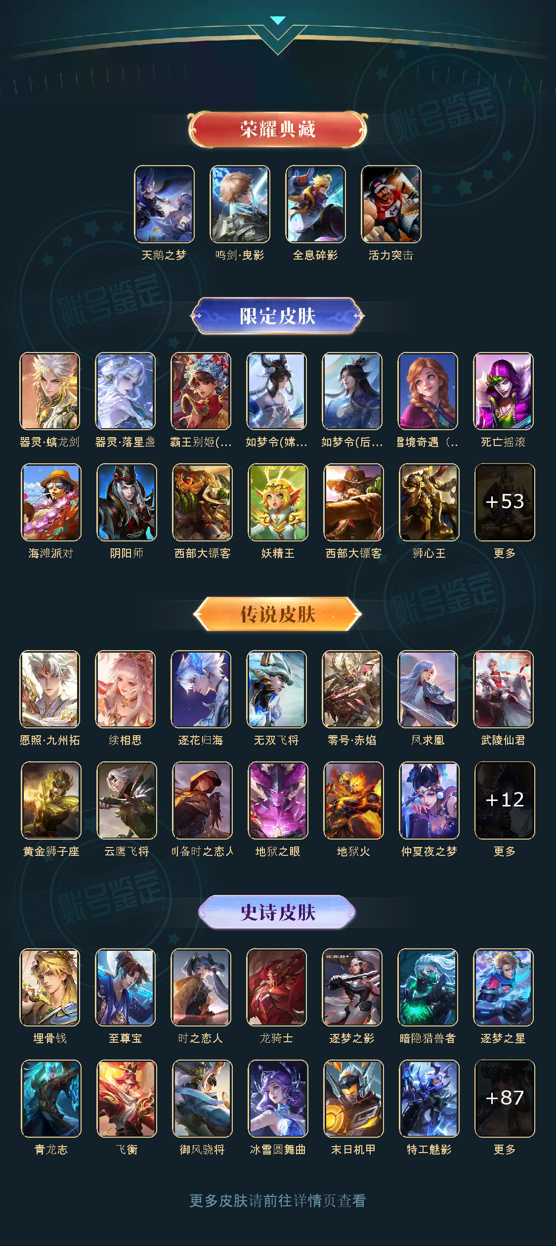 贵族等级V10,英雄数量124,典藏皮肤数4,皮肤数量349,街头霸王/天鹅之梦/至尊宝/凤求凰/逐梦之影/武陵仙君/黄金狮子座/全息碎影/青龙志/活力突击/飞衡/梁祝/鸣剑·曳影