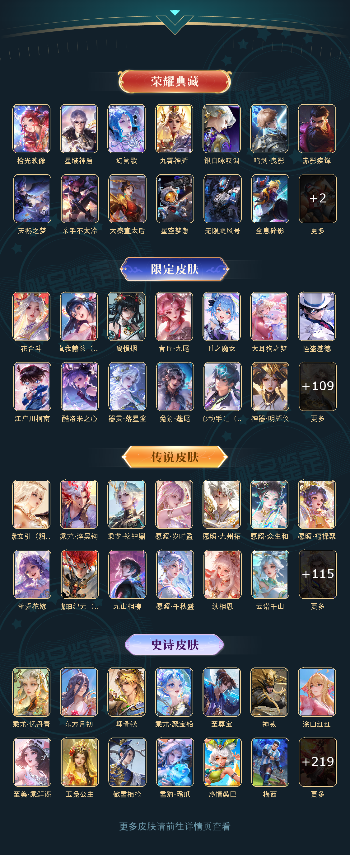 贵族等级V10,英雄数量123,典藏皮肤数15,皮肤数量708,冰锋战神/街头霸王/天鹅之梦/纯白花嫁/天魔缭乱/至尊宝/杀手不太冷/真爱至上/王者之锤/大秦宣太后/凤求凰/热情桑巴/逐梦之影/武陵仙君/神奇女侠/星空梦想/梅西/无限飓风号/黄金狮子座/一生所爱/全息碎影/大圣娶亲/冰霜恋舞曲/青龙志/白虎志/朱雀志/活力突击/太华/久胜战神/飞衡/梁祝/倪克斯神谕/白鹤梁神女/匿光追影者/鸣剑·曳影/遇见胡旋/龙胆/星域神启/李逍遥/武圣/奔雷神使/孙行者/玉兔公主/补天/异界灵契/神威/启示之音/傲雪梅枪/淬星耀世/时雨天司