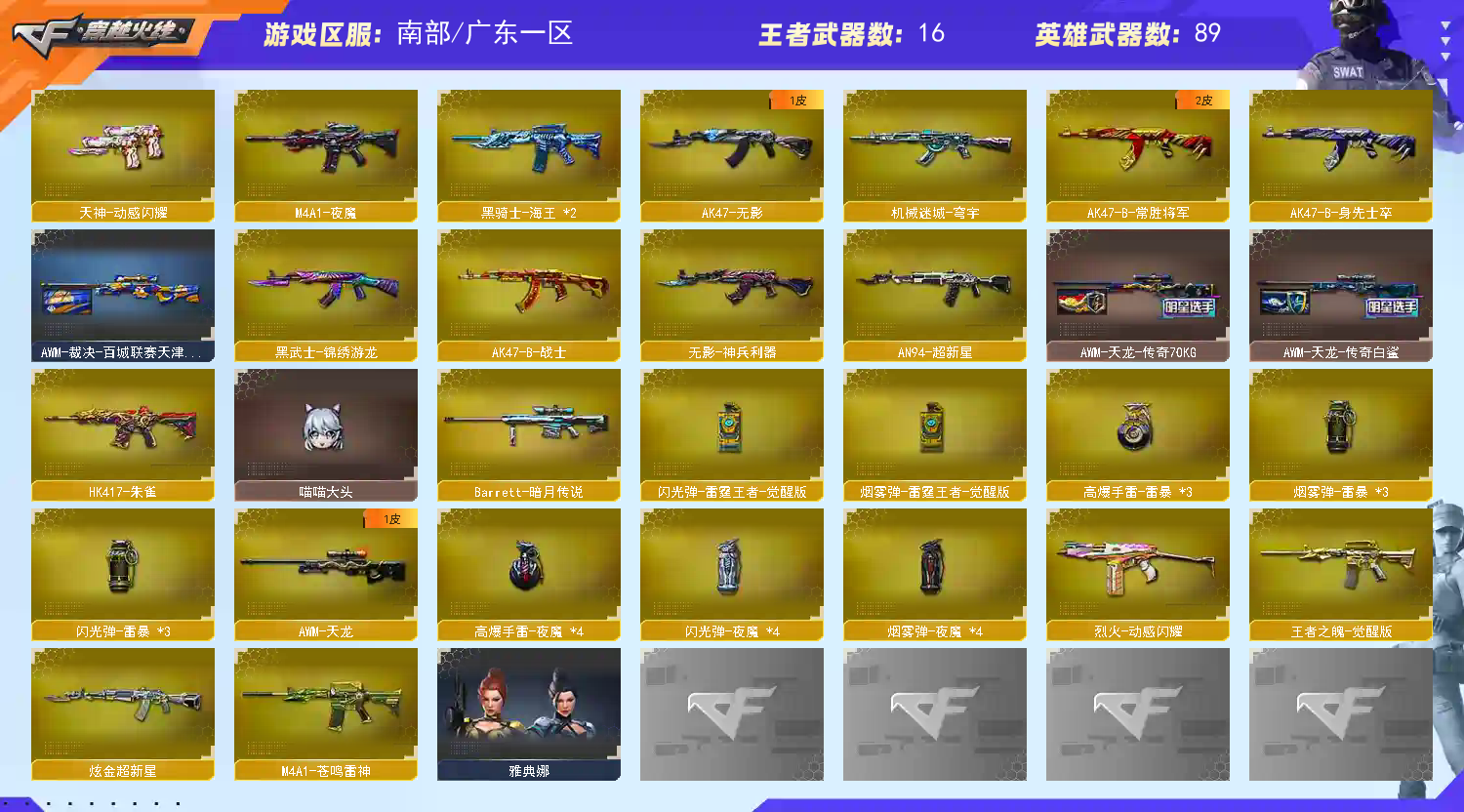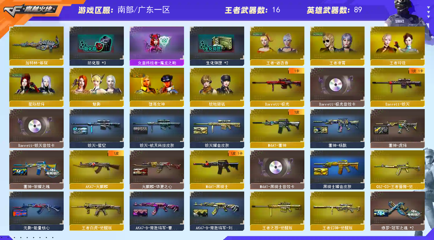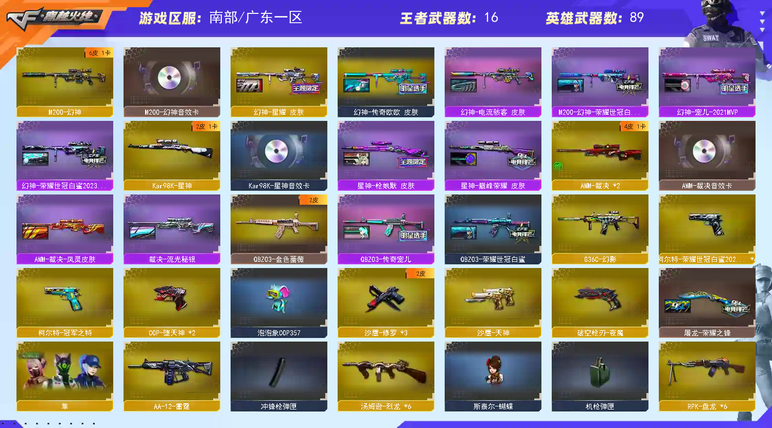 多四防角色,各种皮肤武器光效玩偶道具,欢迎来体验!武器太多,截不了那么多图!【此号全部装备太多截不了太多图,还有很多神器未截图,普通CF点武器也是一百多个就不截图了(满背包满道具爆破、生化、挑战武器应有尽有多个玩偶主流武器多光效),主流枪械都有皮肤】
