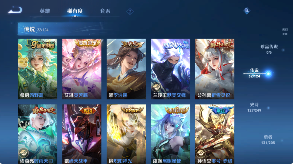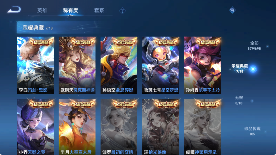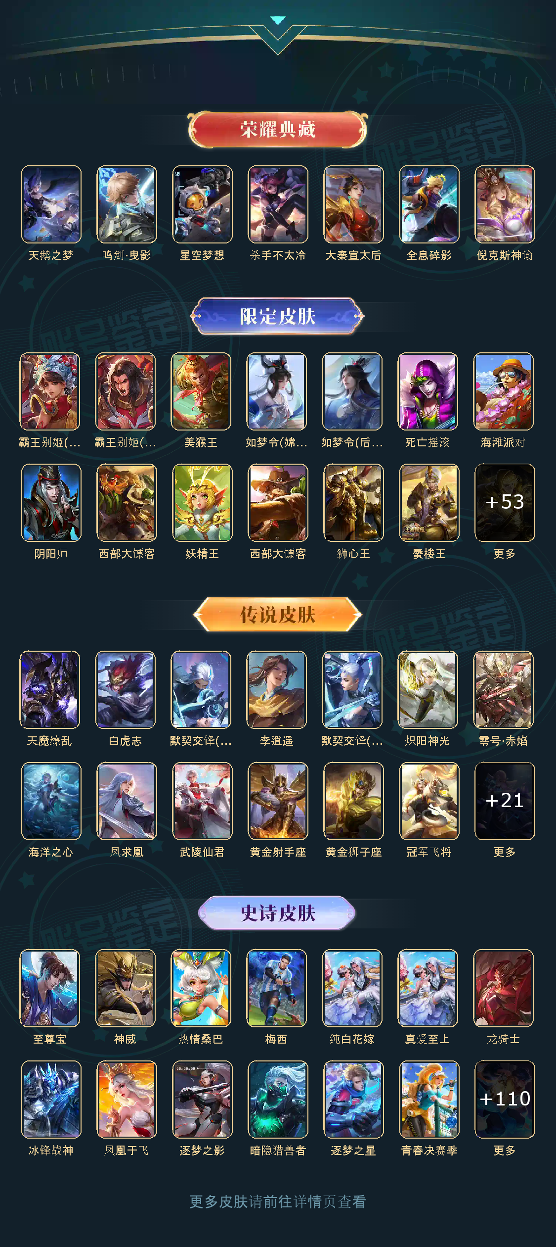 ,英雄数量122,典藏皮肤数7,皮肤数量379,天鹅之梦/大秦宣太后/星空梦想/全息碎影/倪克斯神谕/鸣剑·曳影/李逍遥