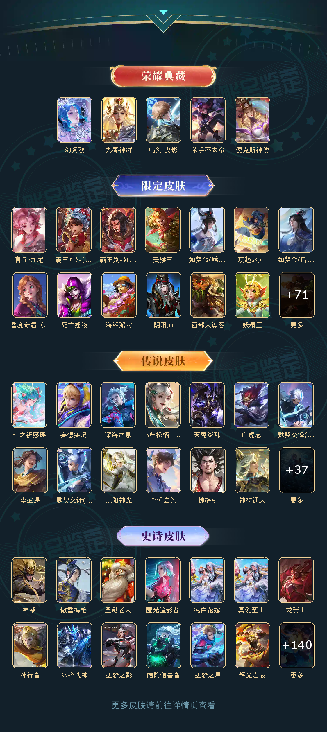 贵族等级V10,英雄数量124,典藏皮肤数5,皮肤数量461,冰锋战神/街头霸王/纯白花嫁/天魔缭乱/杀手不太冷/真爱至上/圣诞老人/凤求凰/逐梦之影/武陵仙君/神奇女侠/一生所爱/大圣娶亲/冰霜恋舞曲/青龙志/白虎志/太华/飞衡/梁祝/倪克斯神谕/白鹤梁神女/匿光追影者/鸣剑·曳影/李逍遥/武圣/奔雷神使/孙行者/神威/傲雪梅枪/淬星耀世/时雨天司
