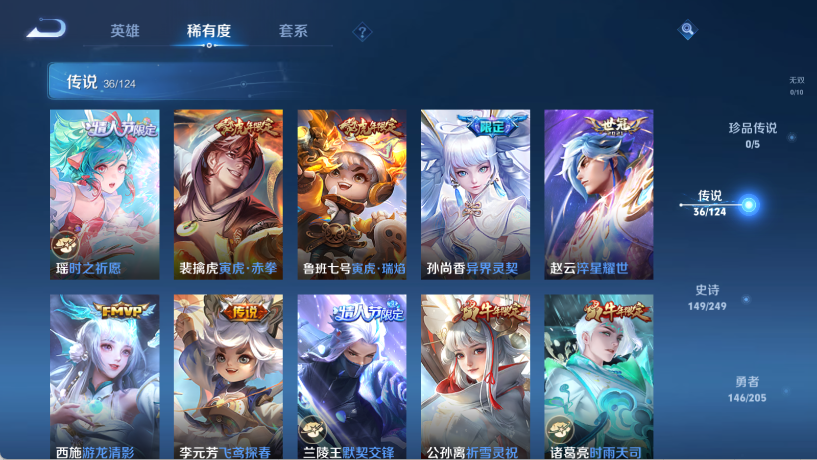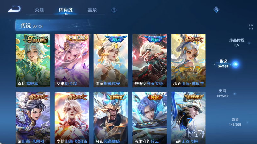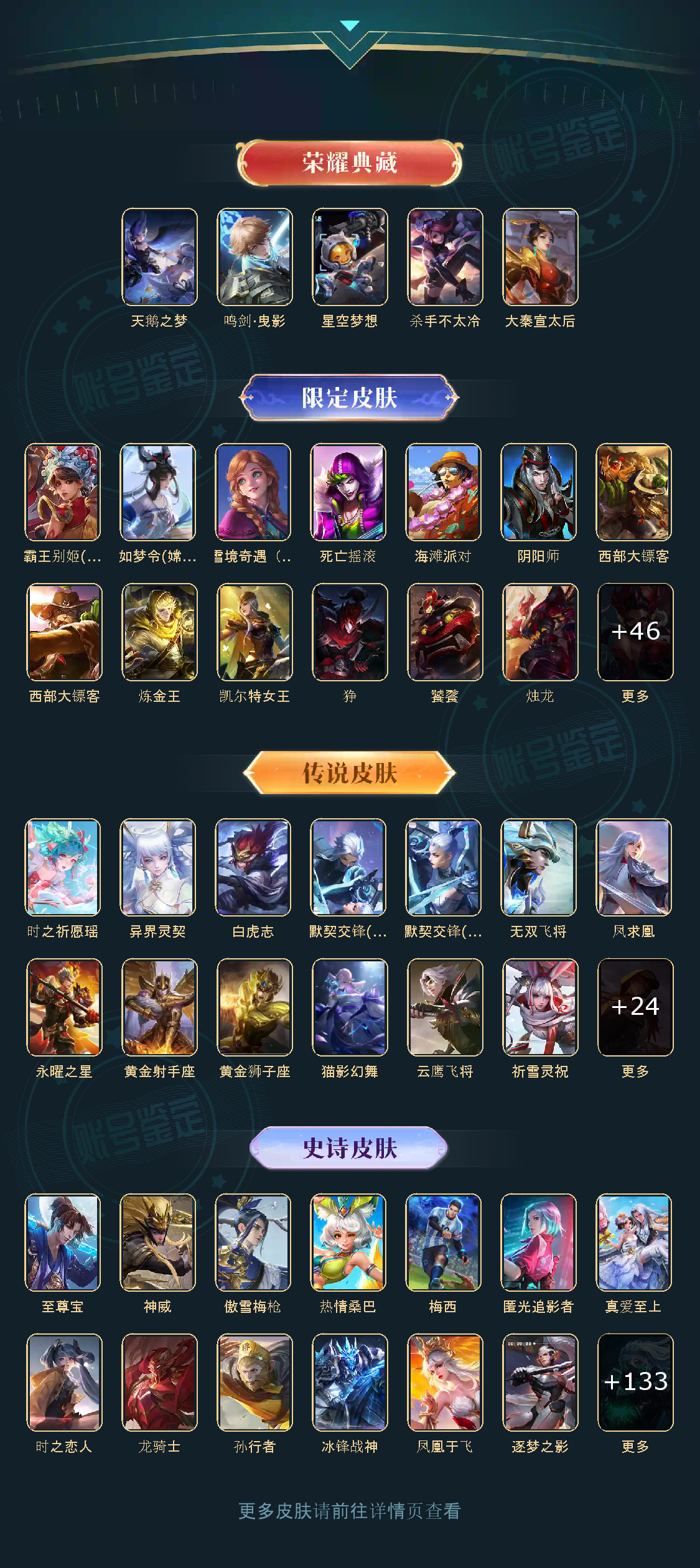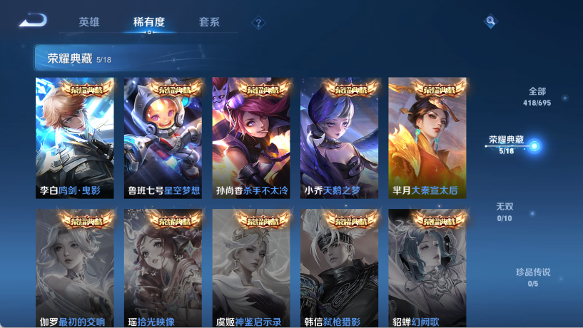 贵族等级V10,英雄数量122,典藏皮肤数2,皮肤数量418,