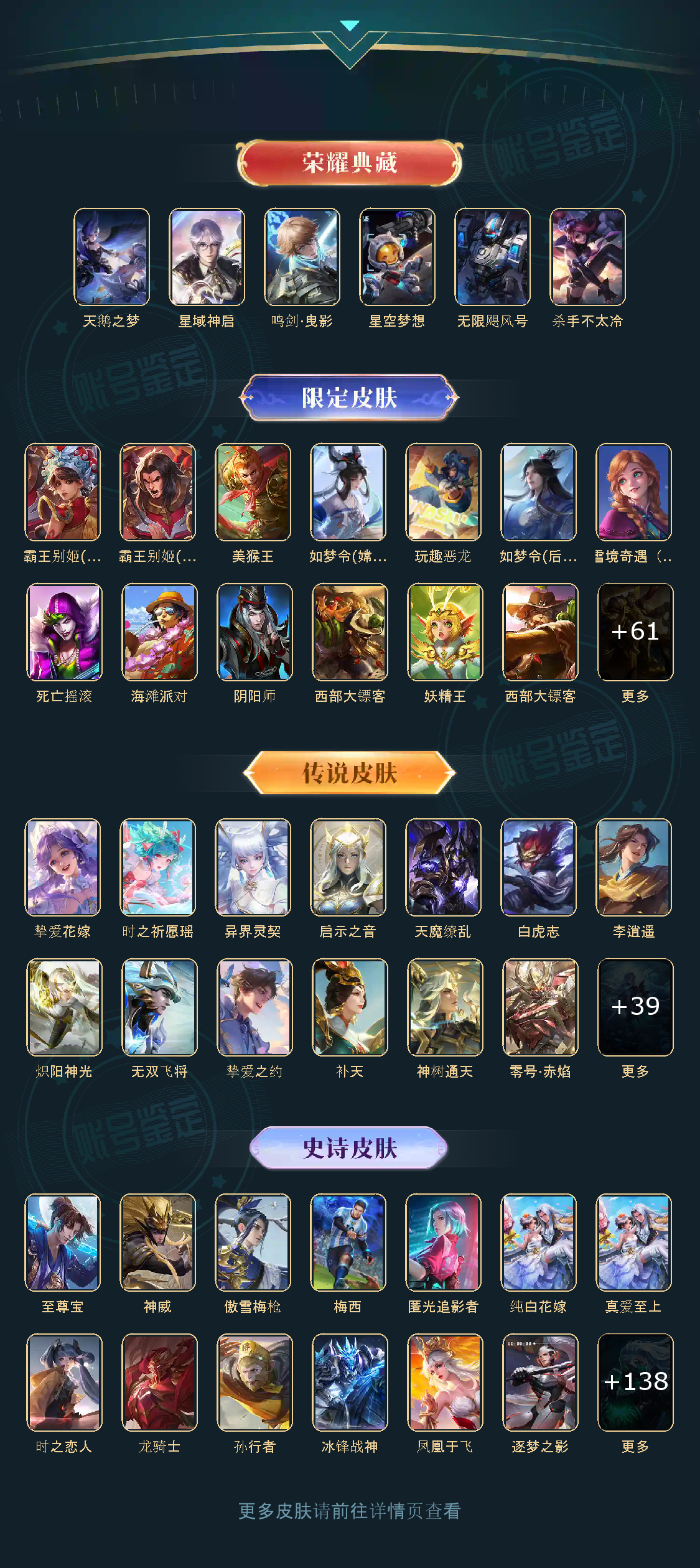 贵族等级V10,英雄数量123,典藏皮肤数6,皮肤数量434,天鹅之梦/杀手不太冷/星空梦想/无限飓风号/鸣剑·曳影/补天/启示之音