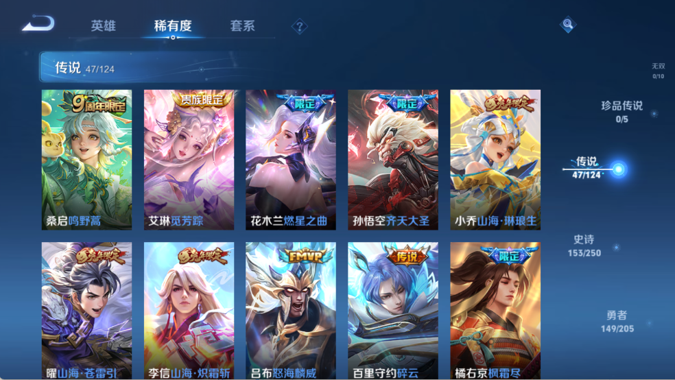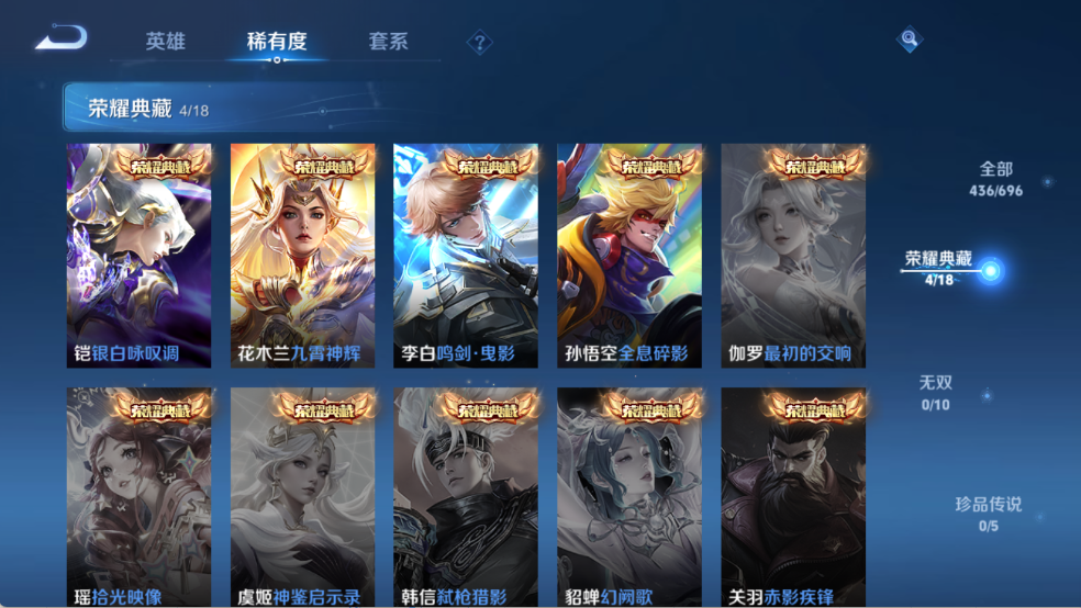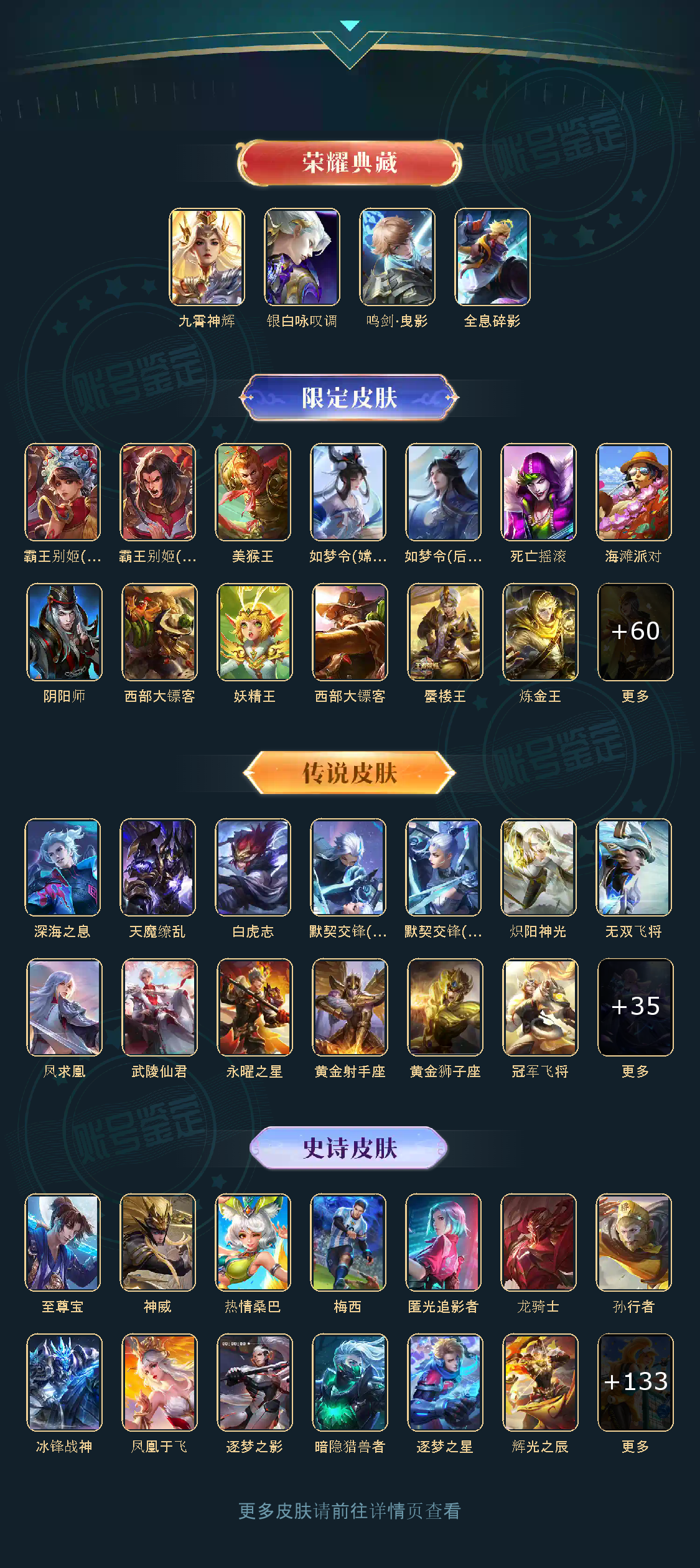 鸣剑·曳影,九霄神辉,银白咏叹调,天魔缭乱,白虎志,默契交锋(兰陵王),默契交锋(花木兰),炽阳神光,热情桑巴,梅西,至尊宝,神威,匿光追影者,无双飞将,深海之息
