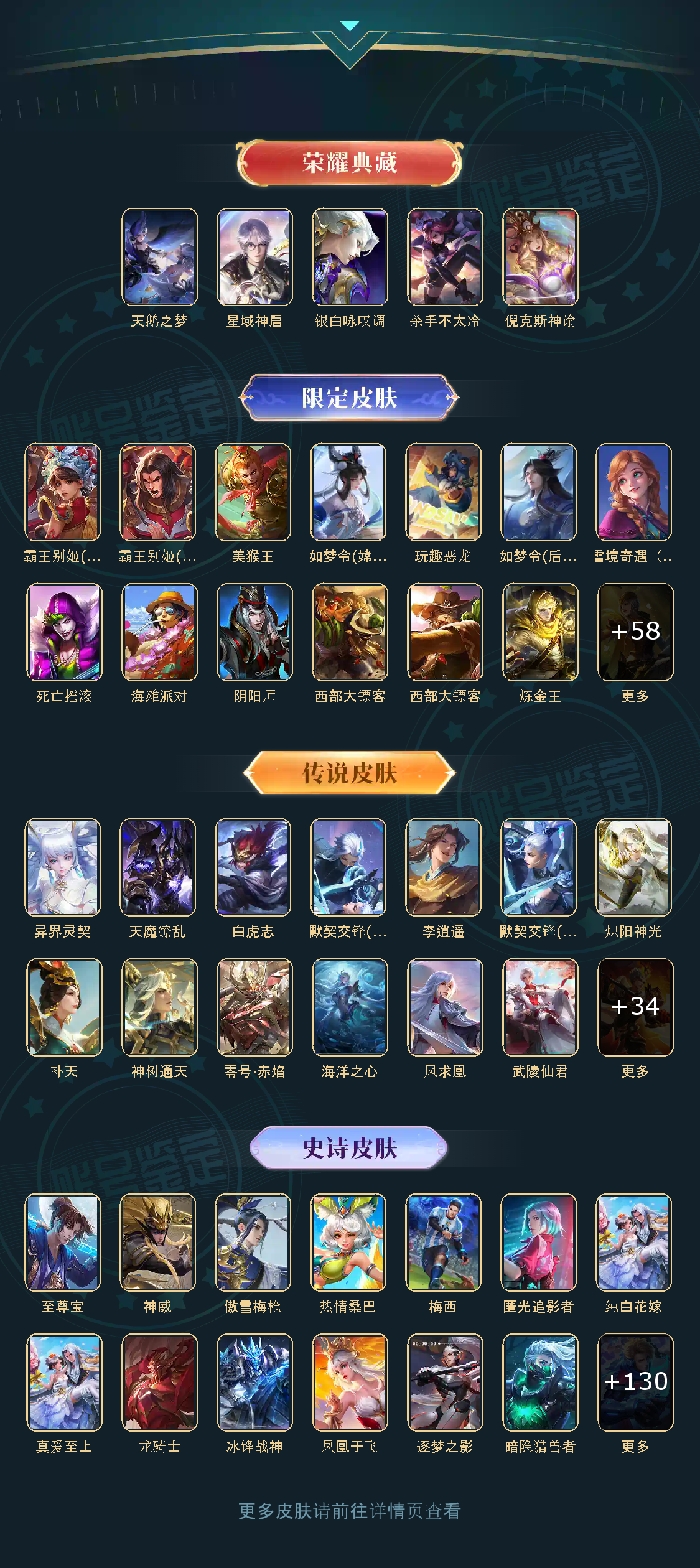 贵族等级V10,英雄数量124,典藏皮肤数5,皮肤数量422,