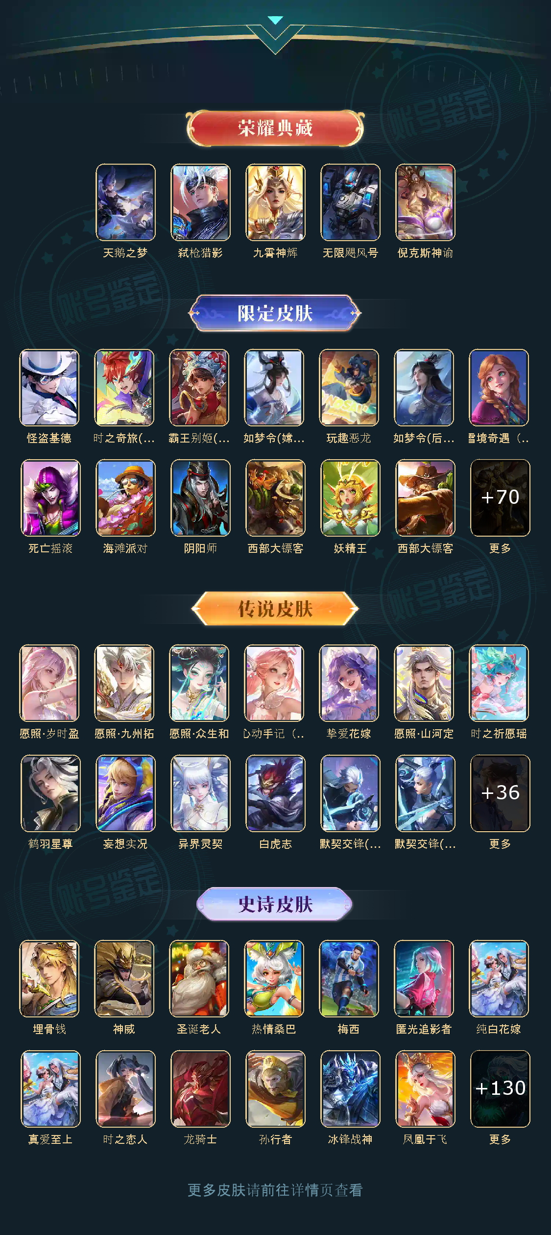 贵族等级V10,英雄数量125,典藏皮肤数5,皮肤数量448,天鹅之梦/无限飓风号/倪克斯神谕/补天