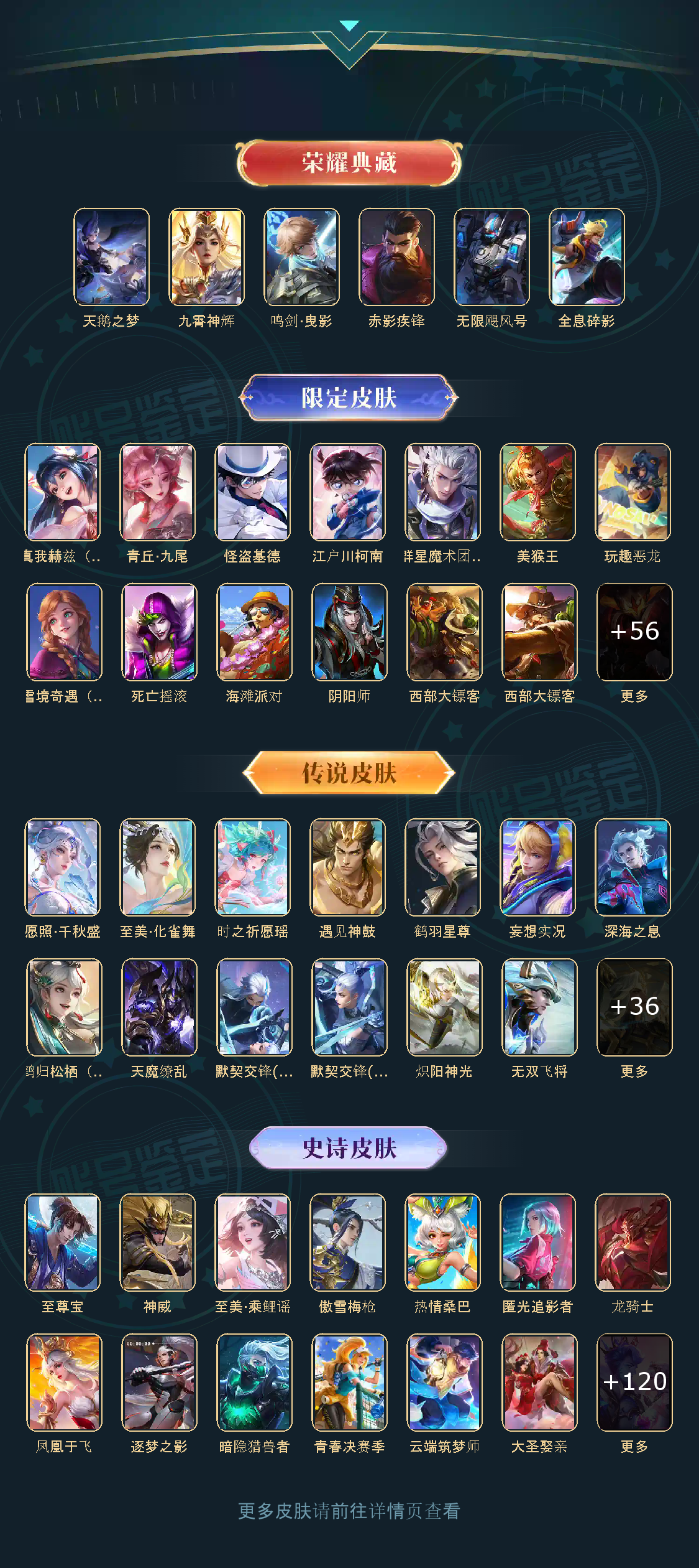 贵族等级V9,英雄数量124,典藏皮肤数6,皮肤数量436,天鹅之梦/无限飓风号/全息碎影/鸣剑·曳影