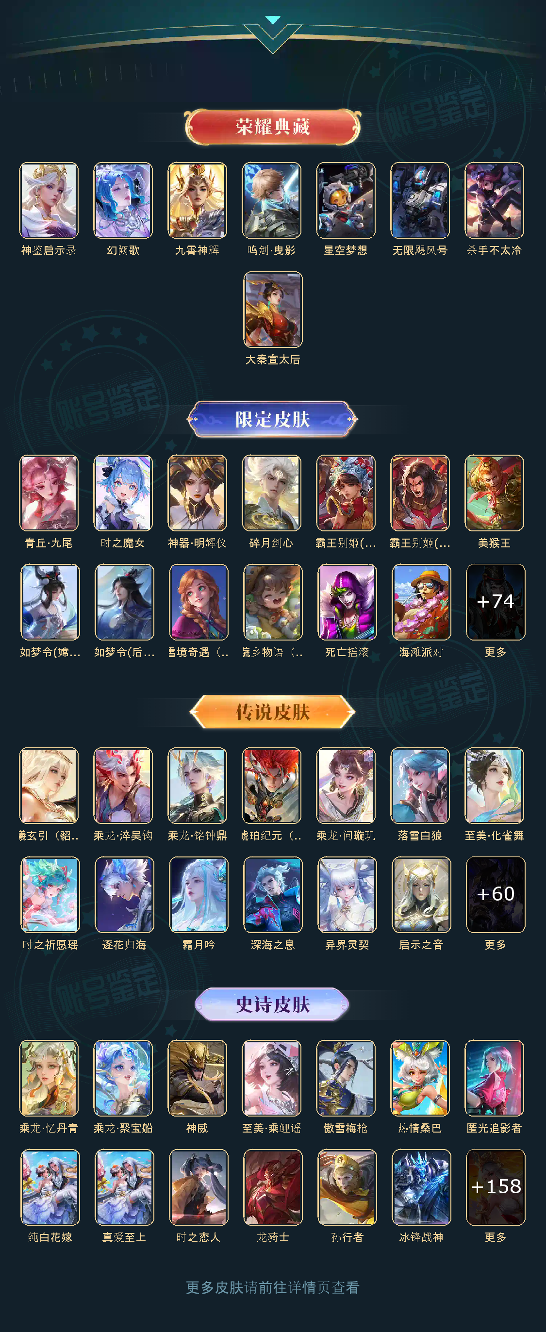 贵族等级V10,英雄数量125,典藏皮肤数7,皮肤数量506,大秦宣太后/星空梦想/无限飓风号/鸣剑·曳影