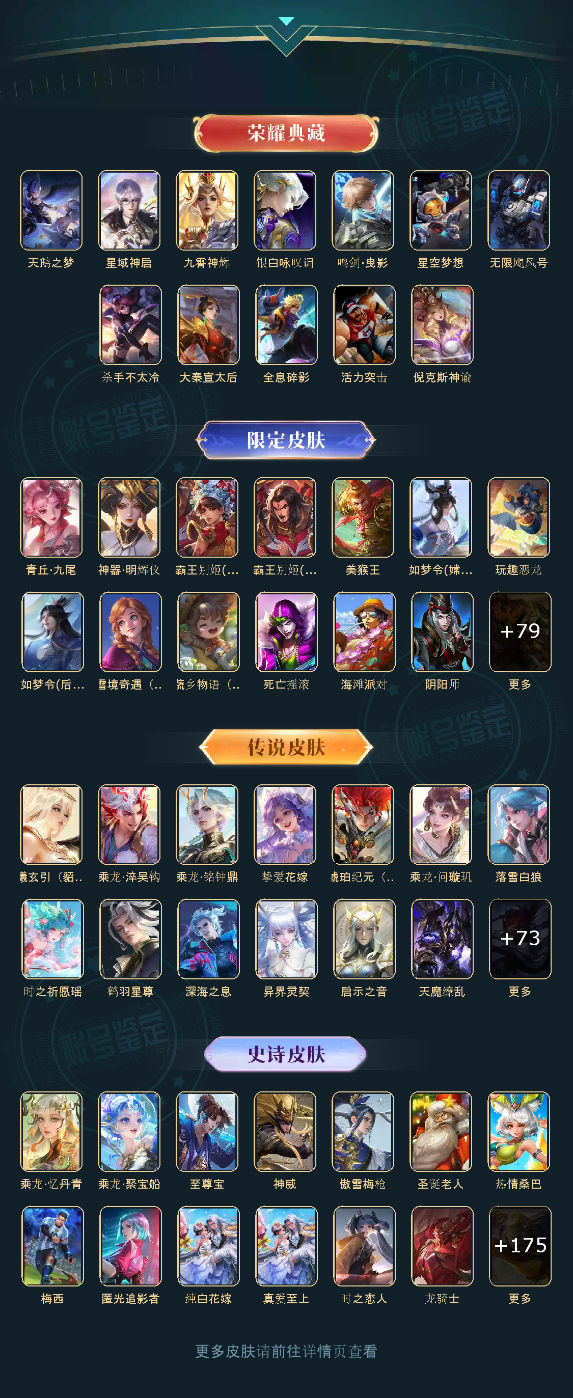 贵族等级,英雄数量125,典藏皮肤数11,皮肤数量548,天鹅之梦/杀手不太冷/星空梦想/无限飓风号/全息碎影/活力突击/倪克斯神谕/鸣剑·曳影/星域神启