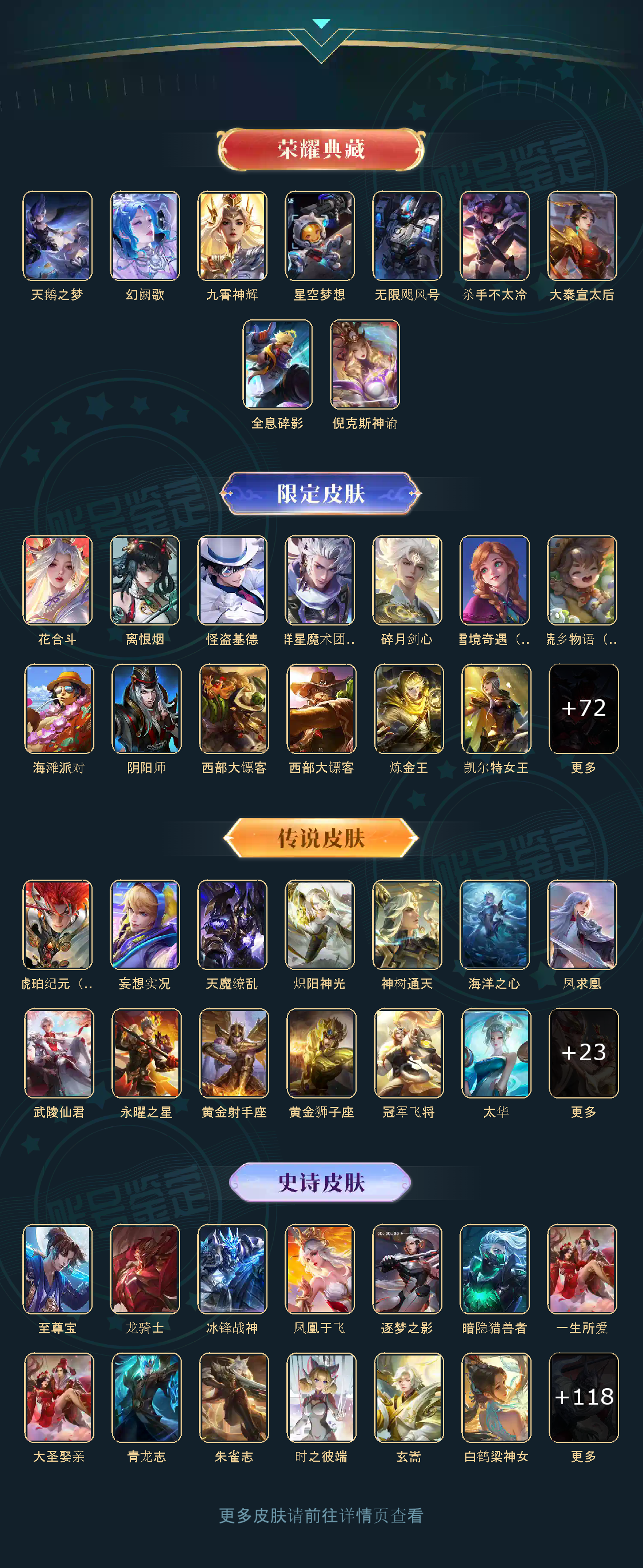 贵族等级V10,英雄数量125,典藏皮肤数8,皮肤数量422,天鹅之梦/星空梦想/无限飓风号/全息碎影/倪克斯神谕