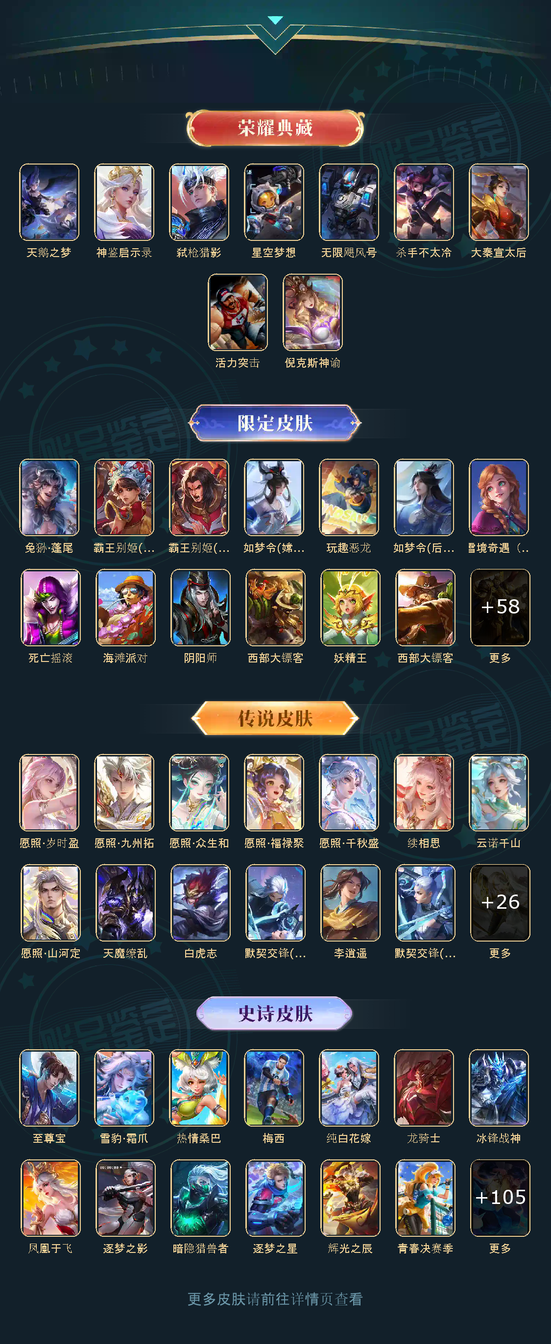 贵族等级V10,英雄数量124,典藏皮肤数8,皮肤数量417,天鹅之梦/星空梦想/无限飓风号/活力突击/倪克斯神谕