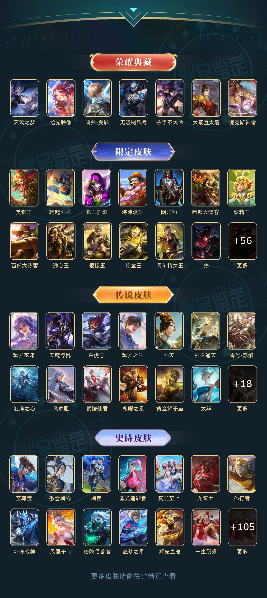 贵族等级V10,英雄数量125,典藏皮肤数7,皮肤数量380,