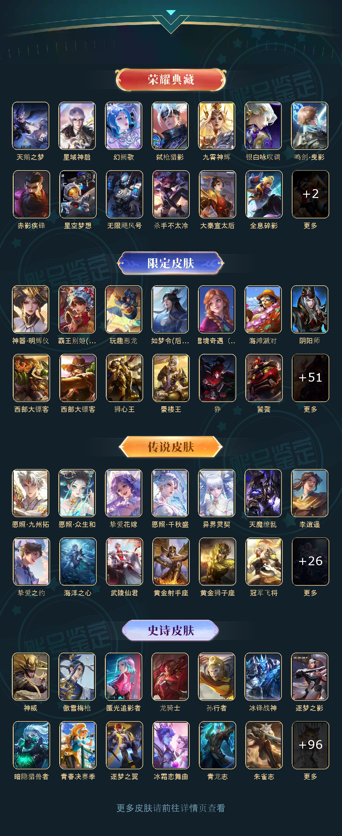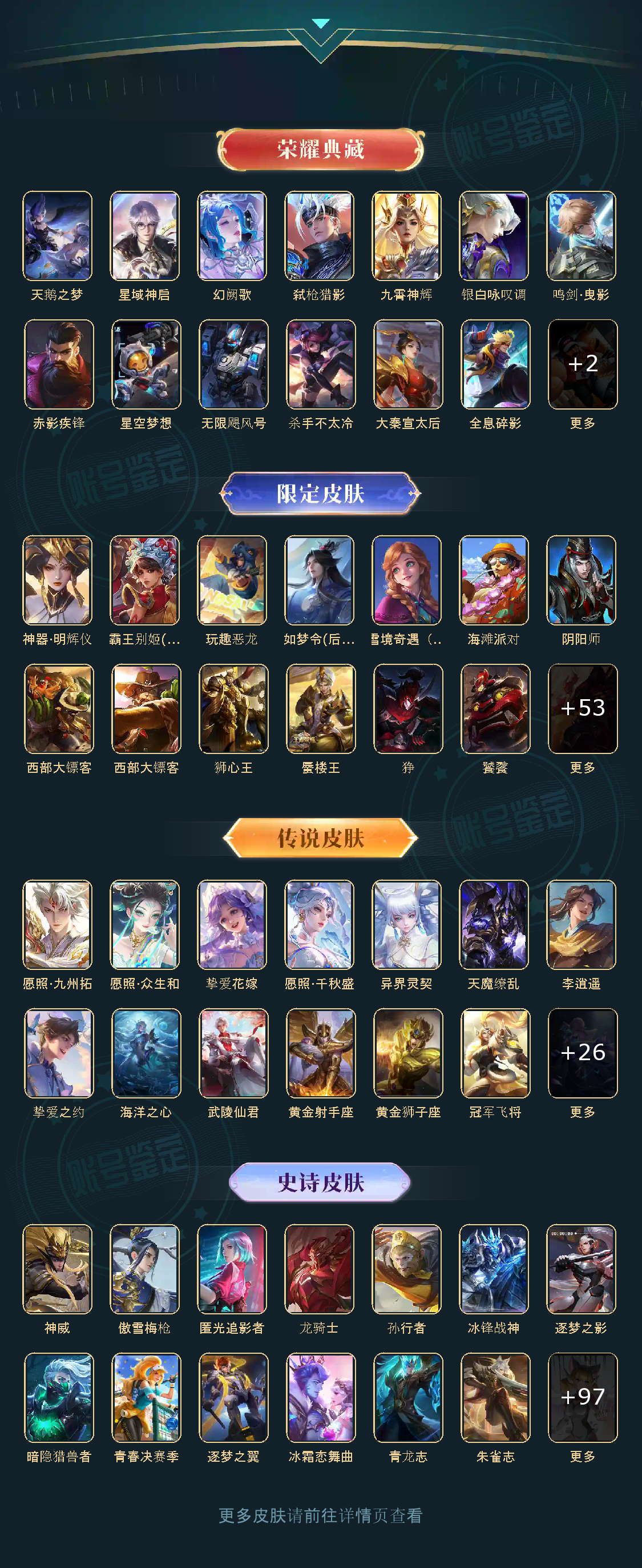 贵族等级V10,英雄数量125,典藏皮肤数15,皮肤数量385,