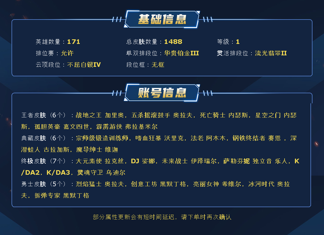 ~~喜欢记得收藏~~可排位~~1500皮全英雄~~租之前尽量查一下游戏ID,确保段位是您需要的,避免浪费您的时间~~请勿挂机逃跑故意送人头,谢谢合作,谢谢~~