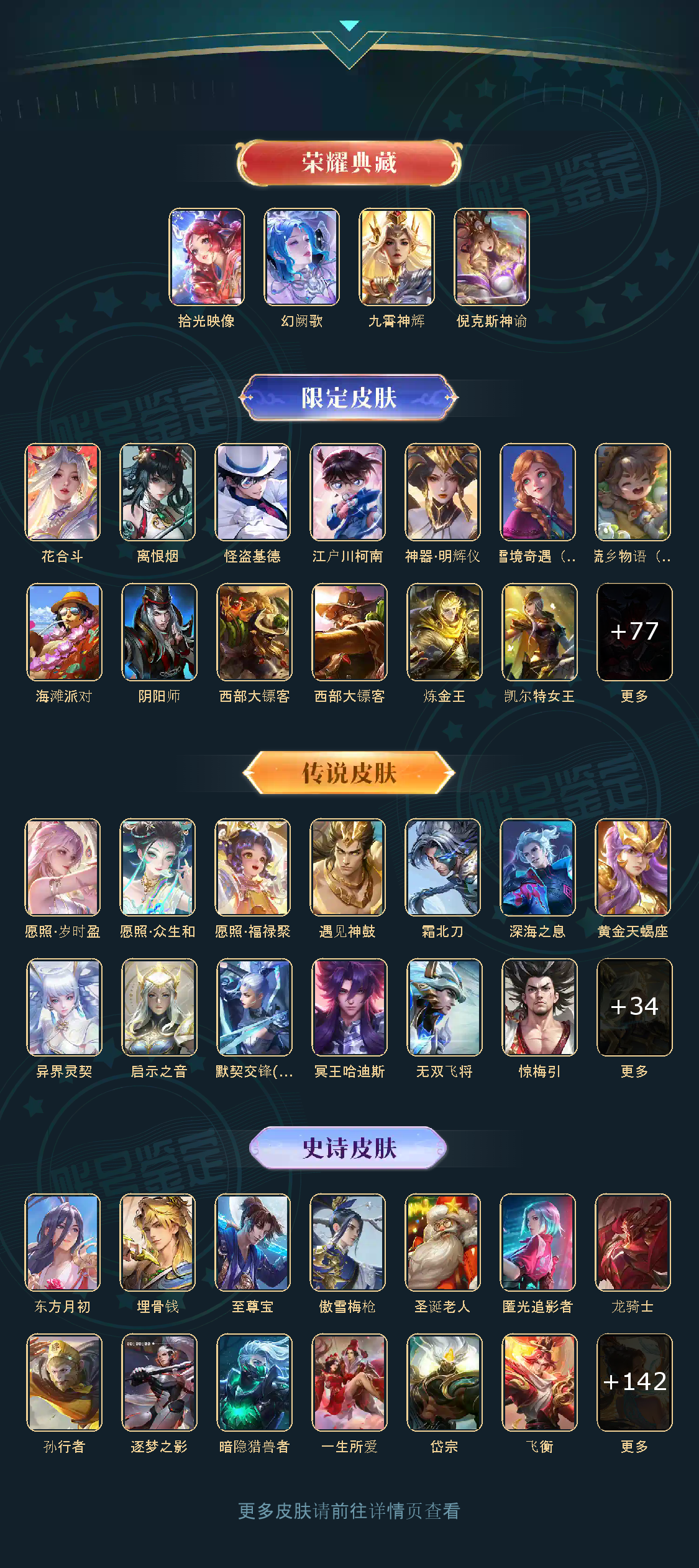贵族等级V10,英雄数量125,典藏皮肤数4,皮肤数量475,倪克斯神谕