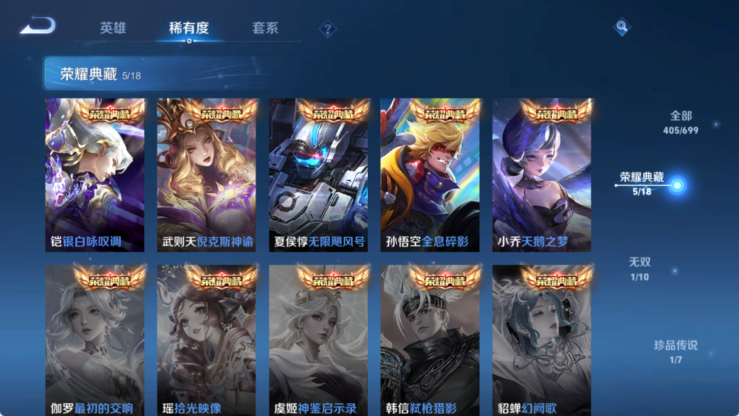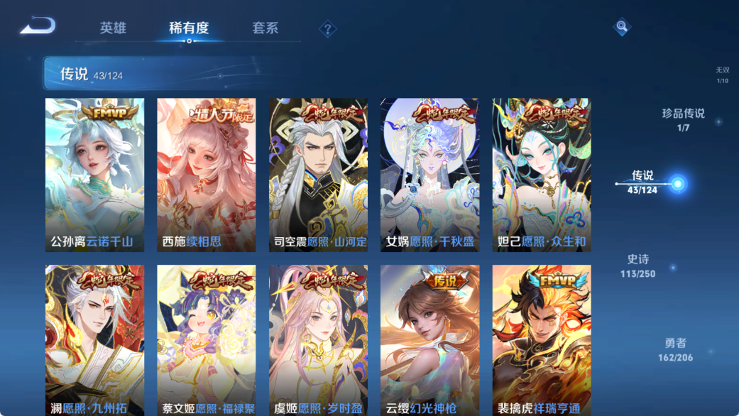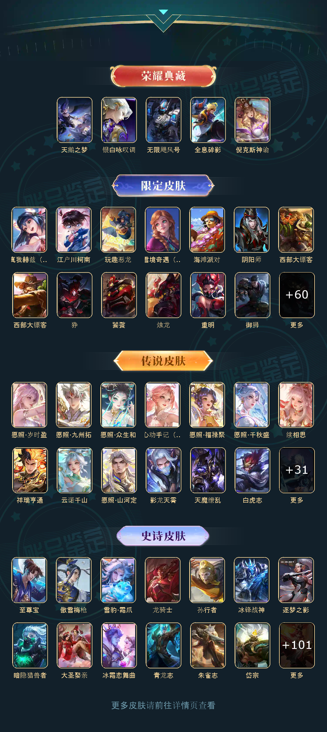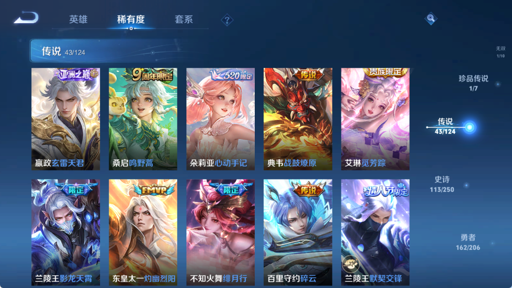 贵族等级V10,英雄数量125,典藏皮肤数5,皮肤数量411,冰锋战神街头霸王天鹅之梦天魔缭乱至尊宝凤求凰逐梦之影无限飓风号全息碎影大圣娶亲冰霜恋舞曲青龙志白虎志朱雀志久胜战神飞衡梁祝倪克斯神谕白鹤梁神女武圣孙行者傲雪梅枪时雨天司