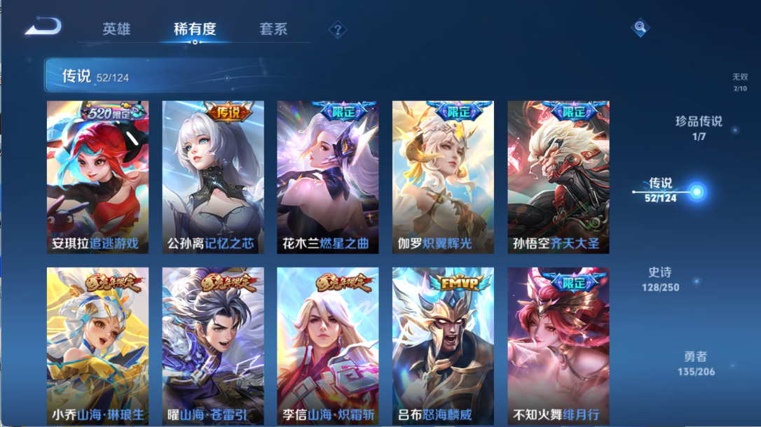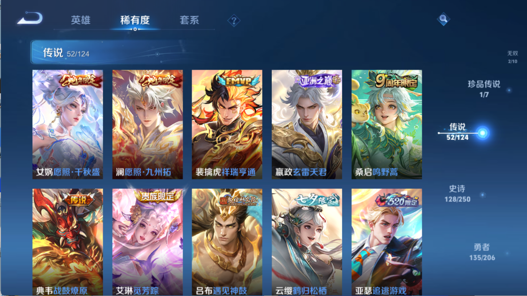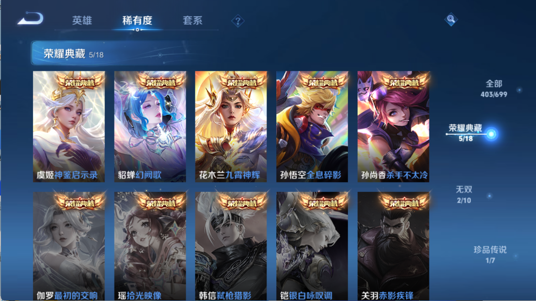 贵族等级V10,英雄数量124,典藏皮肤数5,皮肤数量403,