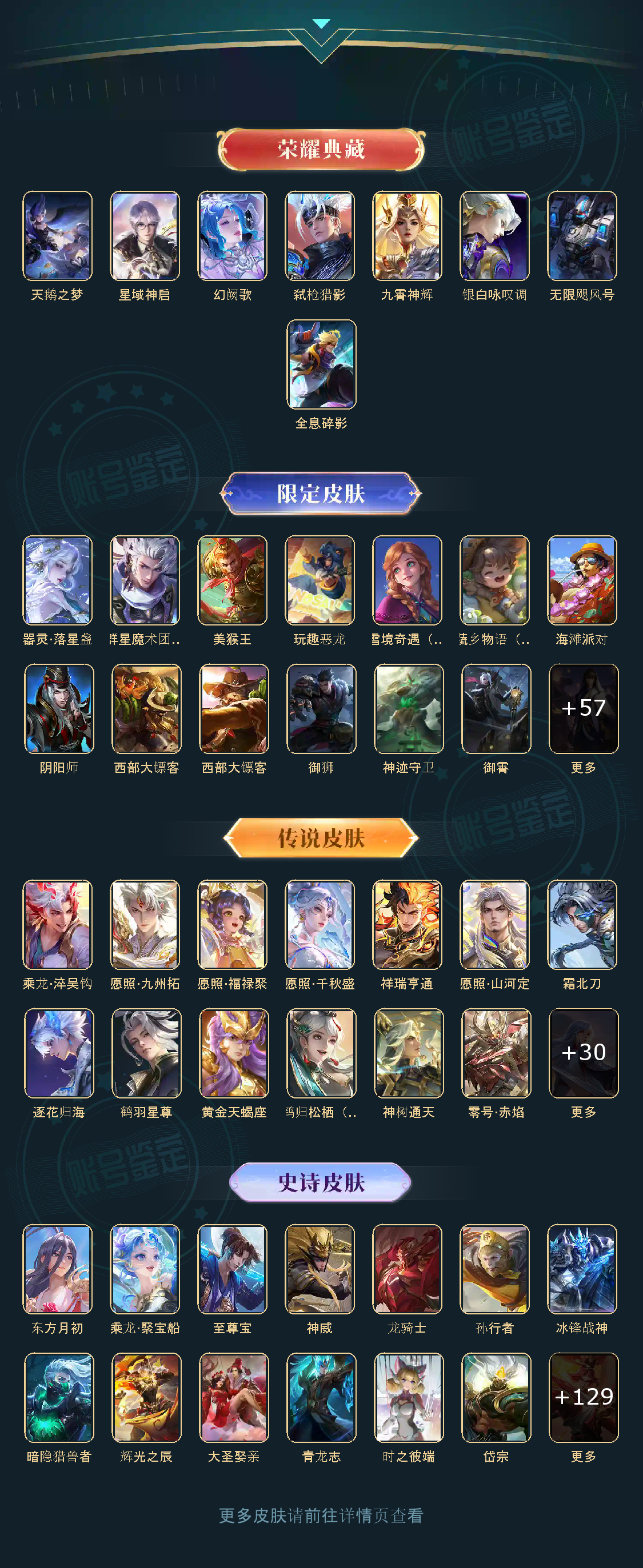 天鹅之梦,无限飓风号,星域神启,幻阙歌,弑枪猎影,九霄神辉,银白咏叹调,群星魔术团(韩信),零号·赤焰,乘龙·淬吴钩,乘龙·聚宝船,至尊宝,神威,愿照·九州拓,愿照·福禄聚,霜北刀,逐花归海,器灵·落星盏,鹤羽星尊,愿照·千秋盛,东方月初,黄金天蝎座,祥瑞亨通,神树通天,鹤归松栖(云缨),愿照·山河定