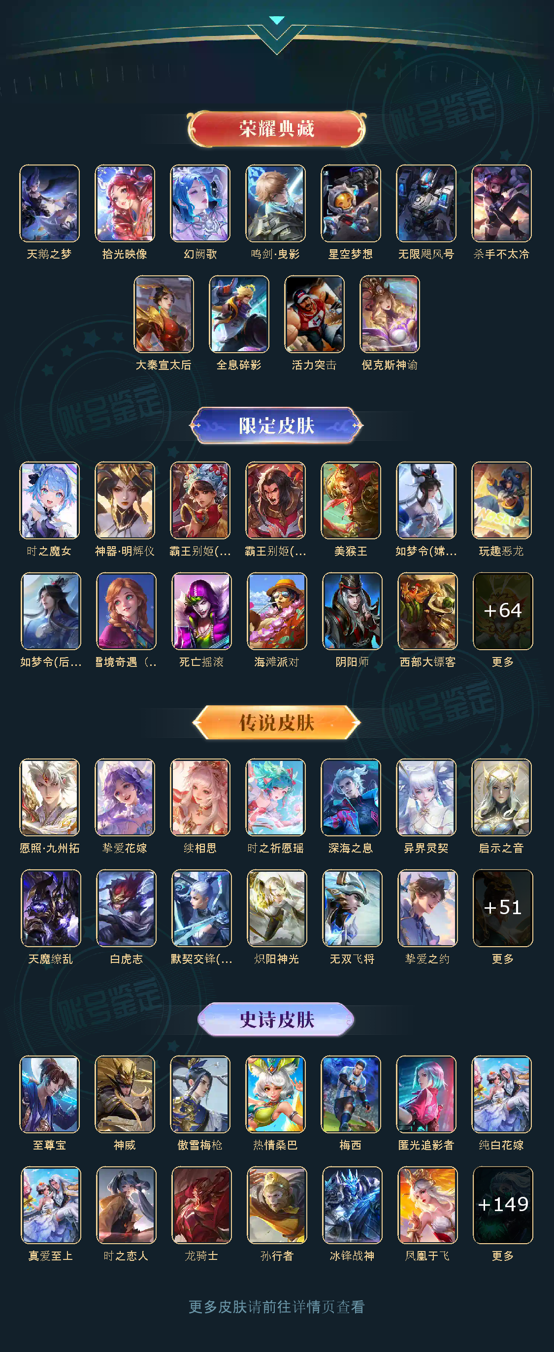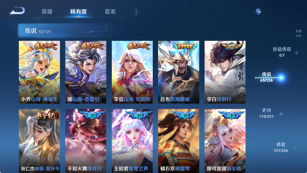 贵族等级V10,英雄数量125,典藏皮肤数11,皮肤数量500,天鹅之梦/杀手不太冷/星空梦想/无限飓风号/全息碎影/活力突击/倪克斯神谕/鸣剑·曳影