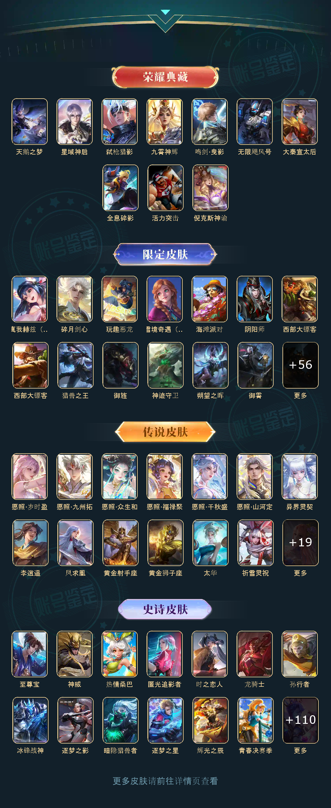 贵族等级V10,英雄数量124,典藏皮肤数10,皮肤数量392,