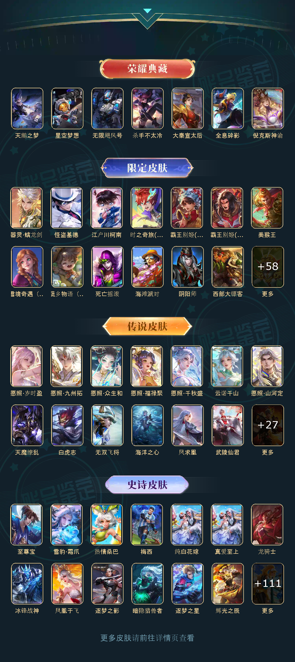 贵族等级V10,英雄数量125,典藏皮肤数7,皮肤数量417,
