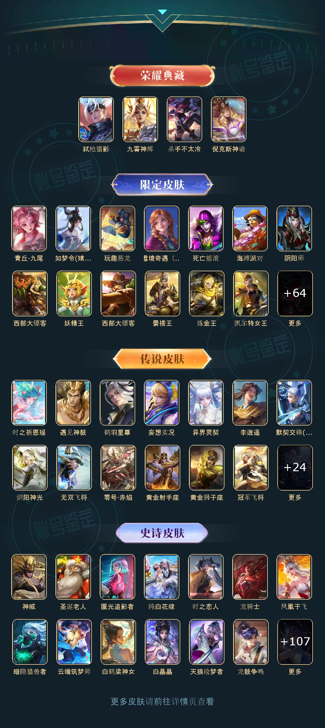 贵族等级V10,英雄数量123,典藏皮肤数4,皮肤数量400,杀手不太冷/倪克斯神谕