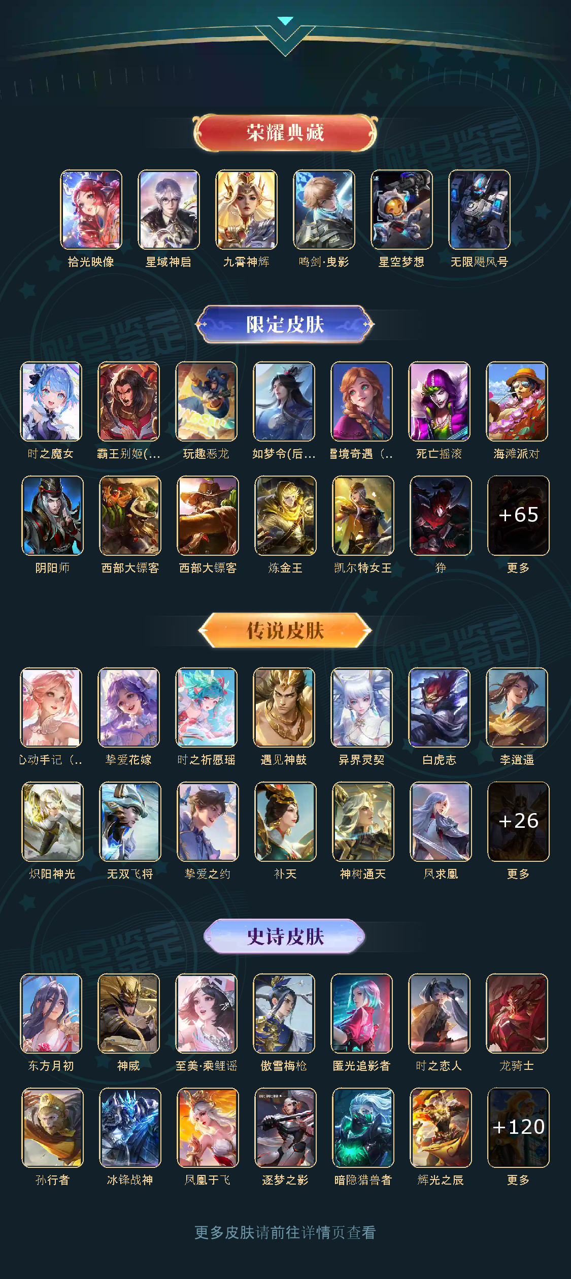 贵族等级V10,英雄数量124,典藏皮肤数4,皮肤数量415,星空梦想/无限飓风号/鸣剑·曳影/星域神启/补天