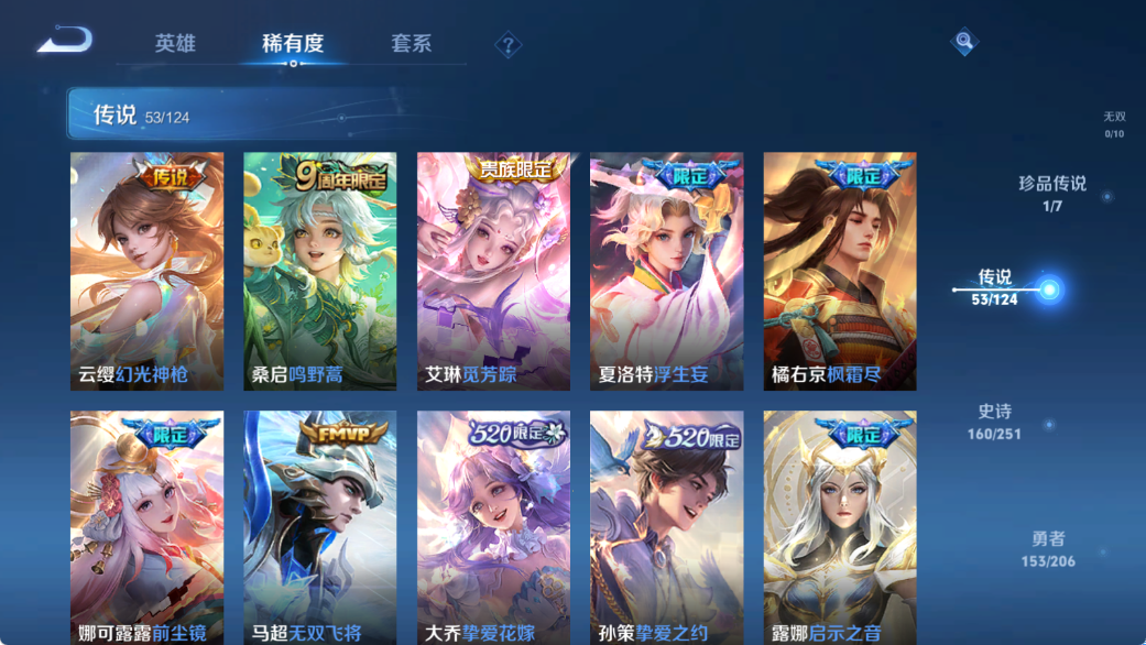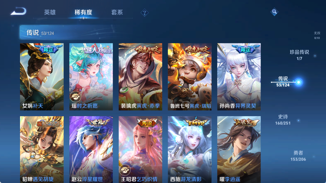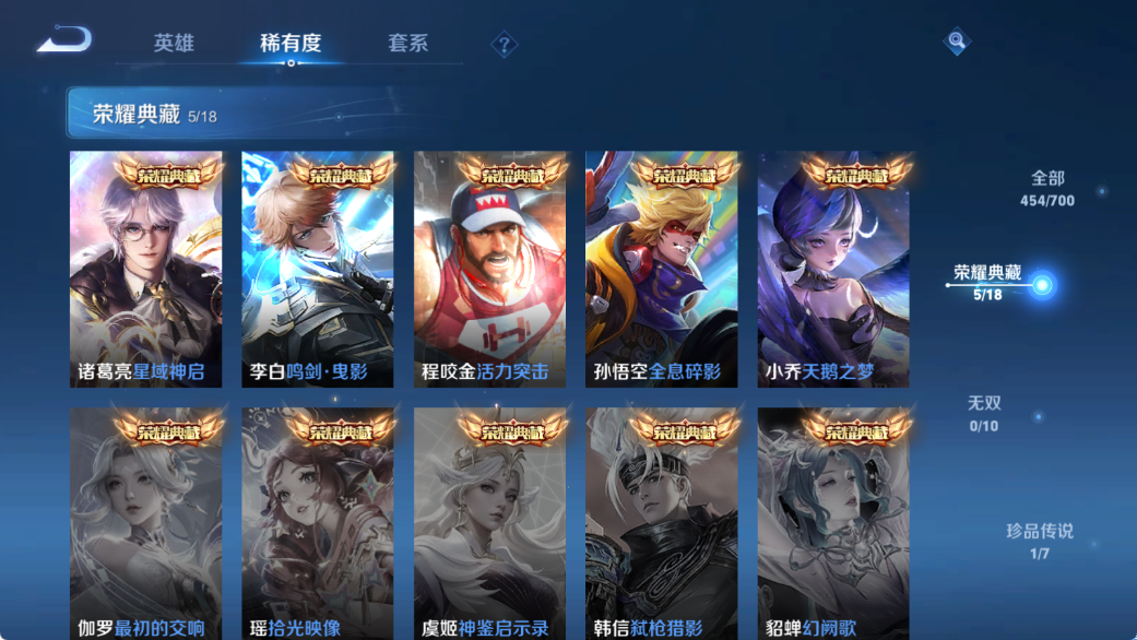 贵族等级V10,英雄数量123,典藏皮肤数5,皮肤数量454,天鹅之梦/全息碎影/活力突击/鸣剑·曳影/星域神启