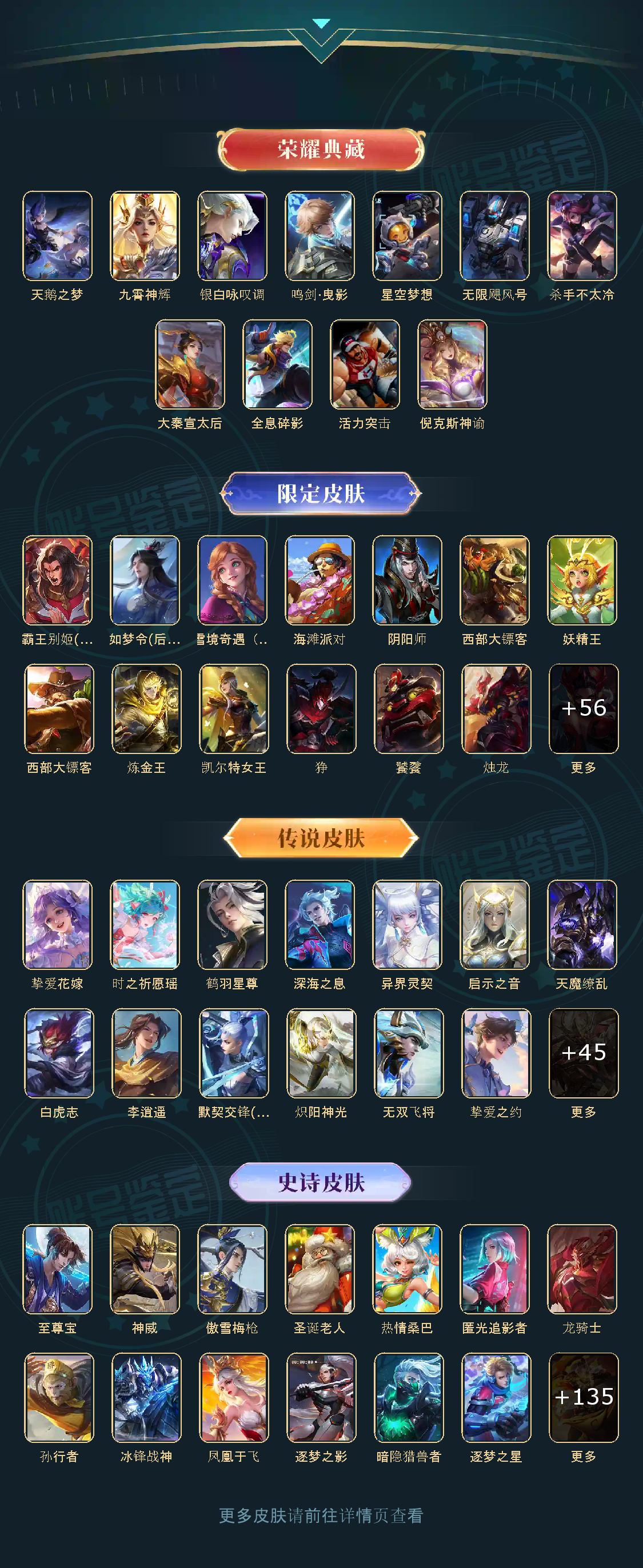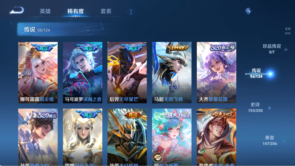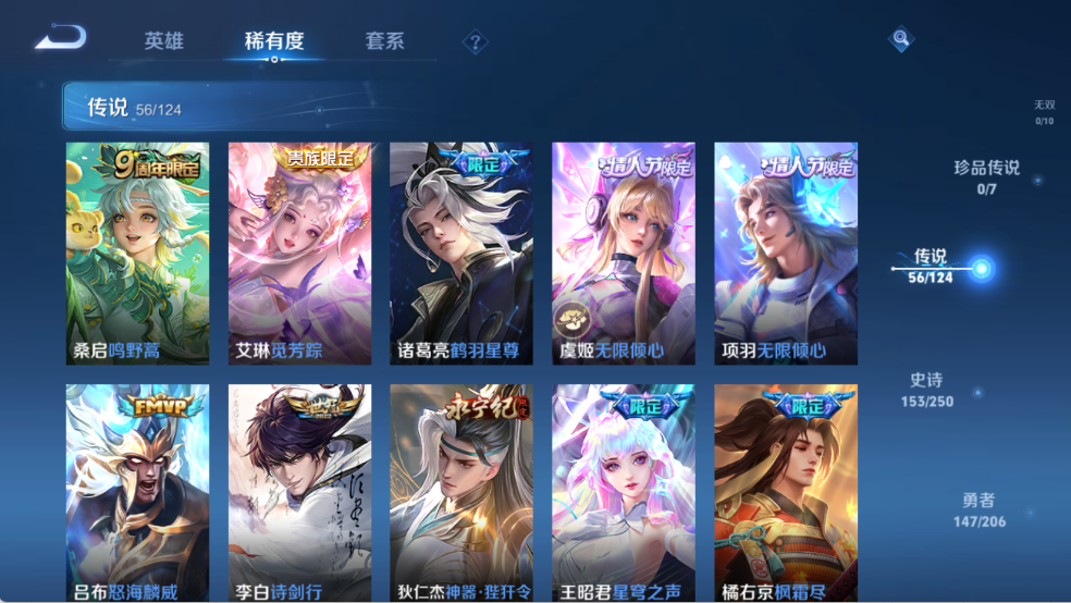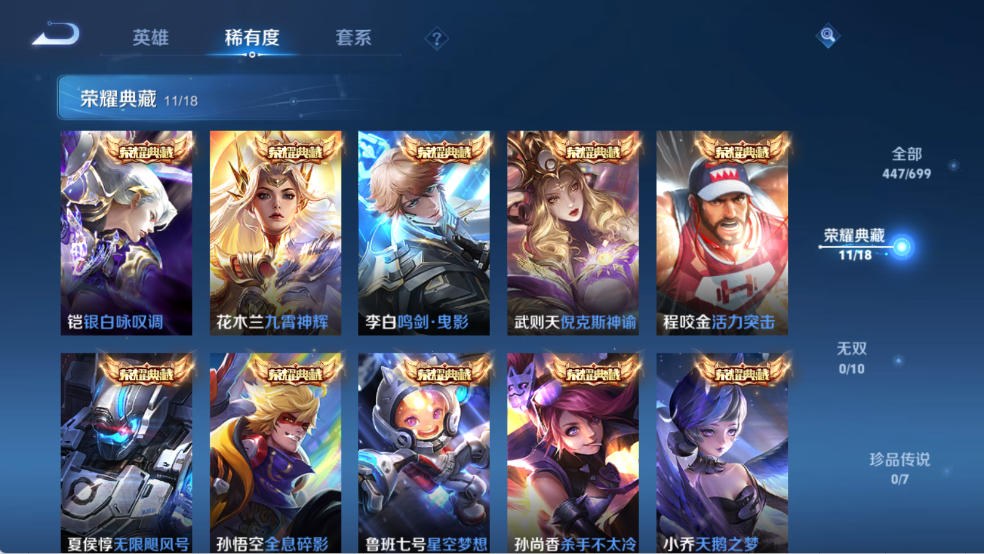 贵族等级V10,英雄数量124,典藏皮肤数11,皮肤数量447,