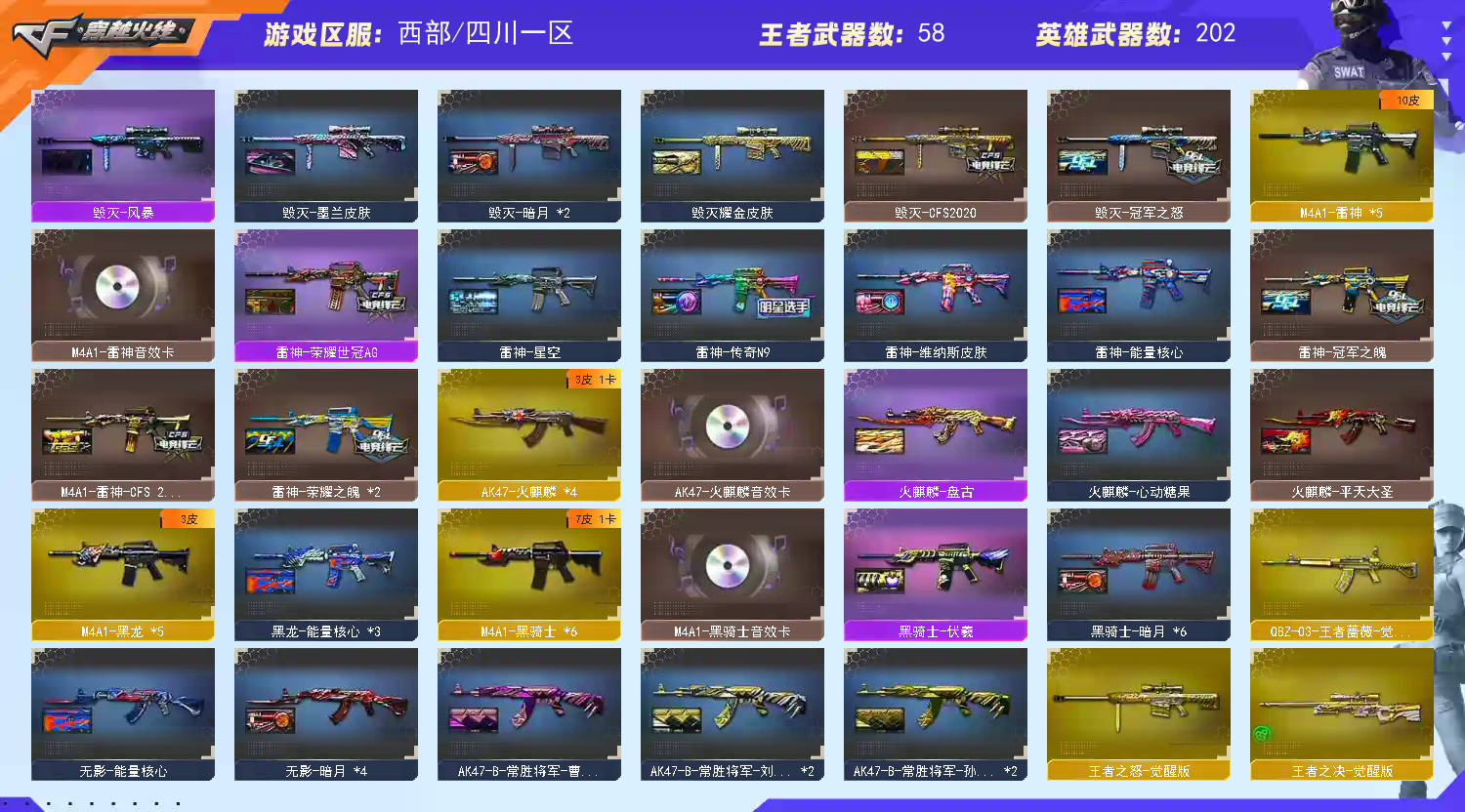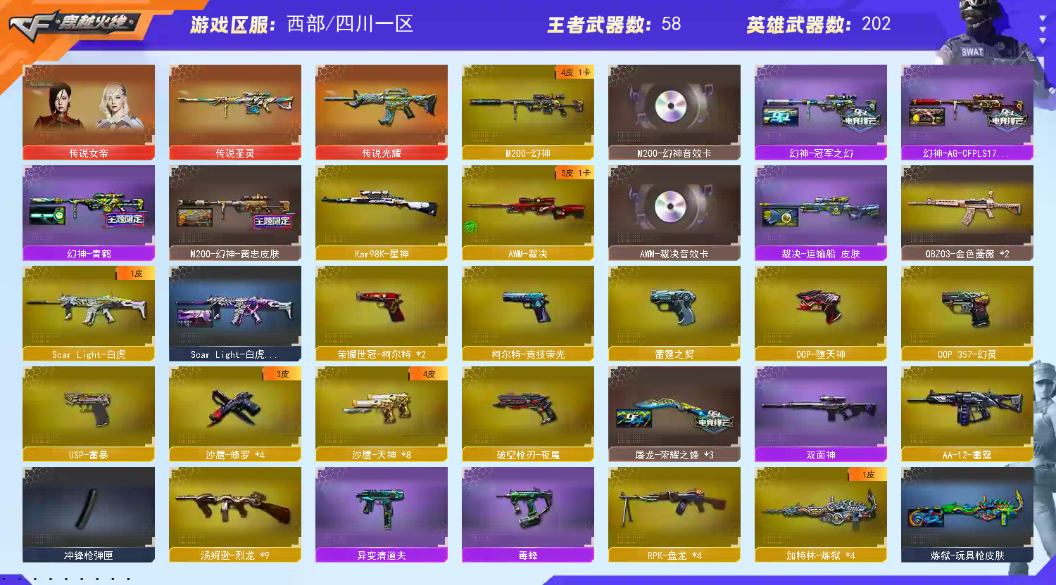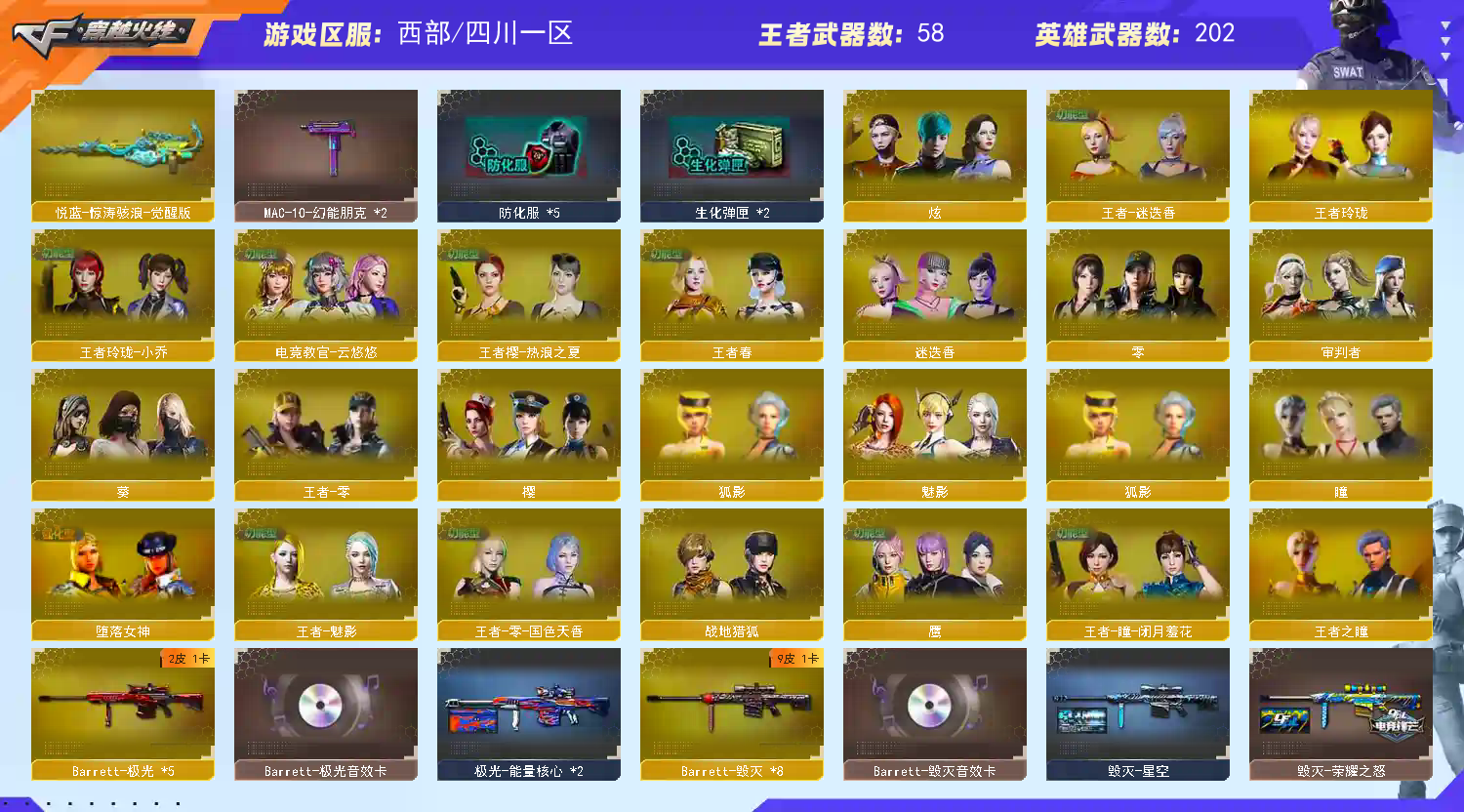 多四防角色,各种皮肤武器光效玩偶道具,欢迎来体验!武器太多,截不了那么多图!【此号全部装备太多截不了太多图,还有很多神器未截图,普通CF点武器也是一百多个就不截图了(满背包满道具爆破、生化、挑战武器应有尽有多个玩偶主流武器多光效),主流枪械都有皮肤】