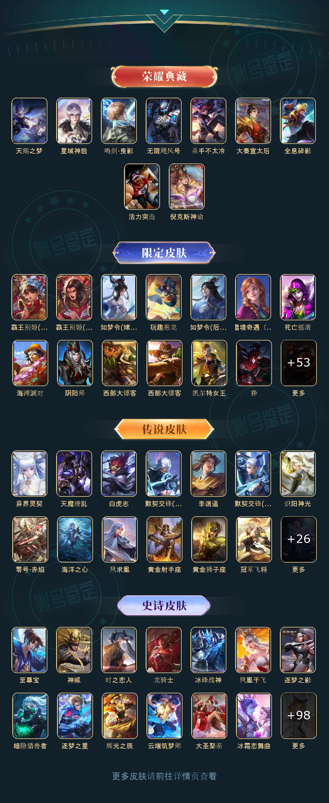 贵族等级V10,英雄数量124,典藏皮肤数9,皮肤数量380,天鹅之梦/杀手不太冷/大秦宣太后/无限飓风号/全息碎影/活力突击/倪克斯神谕/鸣剑·曳影/星域神启