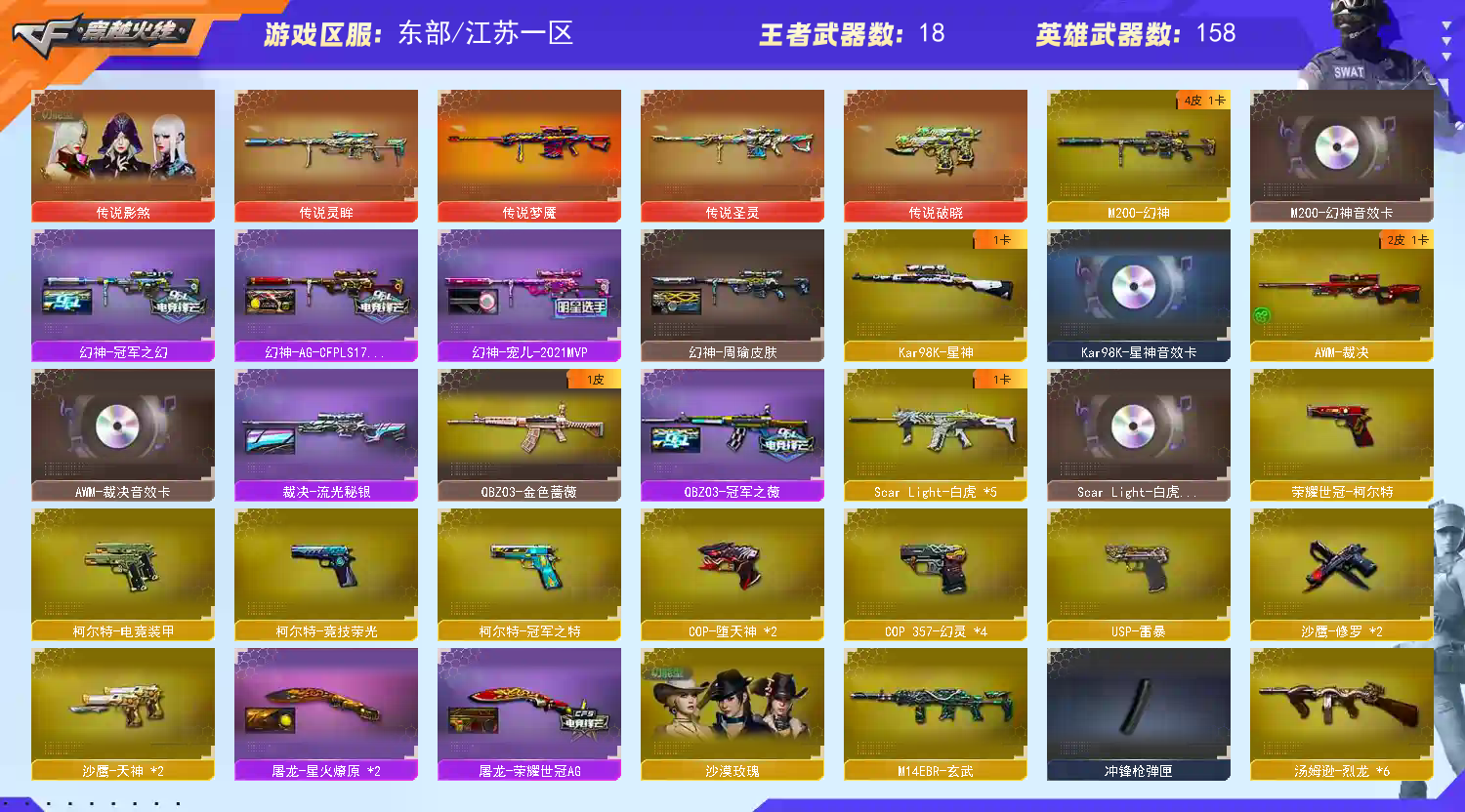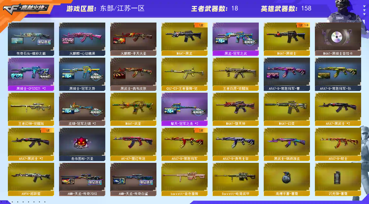 【重要武器皮肤】幻神-宠儿-2021MVP/幻神-冠军之幻/幻神-周瑜皮肤/幻神-AG-CFPLS17冠军/毁灭-SV-CFPLS16冠军/雷神-荣耀世冠AG/屠龙-荣耀世冠AG/QBZ03-冠军之薇/毁灭-冠军之怒/雷神-冠军之魄/黑骑士-冠军之势/黑龙-冠军之武/擎天-冠军之击/龙啸-冠军之啸/毁灭-CFS2020/毁灭-BEAN-2020MVP/毁灭-魔灵皮肤/毁灭-黑大圣皮肤/AWM-天龙-传奇70KG/AWM-天龙-传奇白鲨/天龙-CFSTAR/裁决-流光秘银/雷神-宠儿-2019MVP/雷神-传奇N9/雷神-杨戬/雷神-荣耀之魄/黑骑士-CFS2021/黑武士-典韦皮肤/火麒麟-AG战队皮肤/火麒麟-CFSTAR/火麒麟-平天大圣/火麒麟-心动糖果/火麒麟-百城/传奇石头-横秒之巅/AK47-B-常胜将军-孙权/AK47-B-常胜将军-曹操/AK-47-雷神/战神-流金岁月皮肤/白虎-电玩粉兔皮肤/修罗-CFSTAR/屠龙-星火燎原