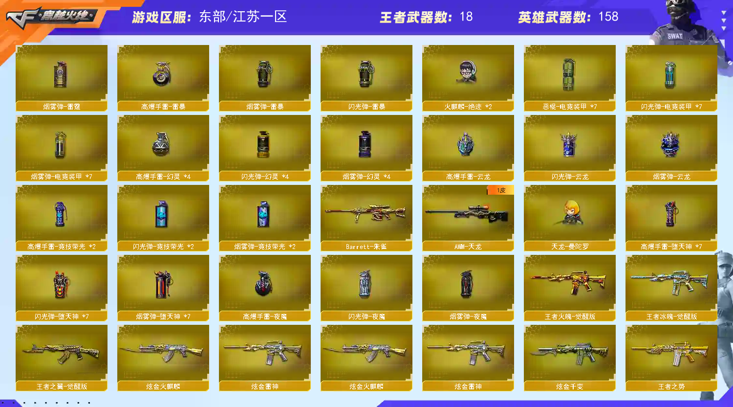 【其他重要武器】炫金千变/炫金火麒麟/炫金雷神/机甲撕裂者III/QBZ03-吕布/AK47-祥云苍龙/黄金AK-47/AK47-轮回/Scar-Light-赤血龙魂/QBZ03-麟龙/AK47-苍龙(2)/AK-47-二次元/M14EBR-赤血龙魂(2)/AK47-齐天大圣/M4A1-水枪-机甲核心/M4A1-樱/雷神-赛博幻想/AK47-破空冰刃(2)/AK47-娜塔莎/AWM-A-十周年wegame/M200-大黄蜂/Barrett-战龙/黄金AWM(2)/M82A1-夏日/AWM-A-圣诞2021/Barrett-麟龙/Barrett-捣乱兔兔/凤凰之力/AWM-Pink/98K-炫彩/M82A1-水枪-机甲核心/AWM-Red/M200-青帝/KAC-圣炎切割者III/KAC-小动物(3)/阿梅利轻机枪-暗夜风暴/EVOIII-萌杀/EVO III-赤血龙魂/COP 357-青龙/幻影沙鹰-枪王排位/COP 357-平天大圣(2)/沙鹰-枪王排位/新USP-枪王排位奖励(2)/愤怒公牛左轮-丹龙(2)/COP-青帝(2)/Anaconda-麟龙/COP-机甲刑天/愤怒公牛左轮-枪王排位/沙鹰-能量核心/Anaconda-炽焰核心/丛林匕首-卧龙/蝴蝶刀-枪王排位/Knife-冠军之刃/黄金猫猫手套-白鲨/魔能镰刀/猫猫手套/斩神刀-青帝/军用手斧-能量核心/闪光弹-枪王排位(3)/胜利奖杯手雷-枪王排位/手雷-能量核心/烟雾弹-机甲核心