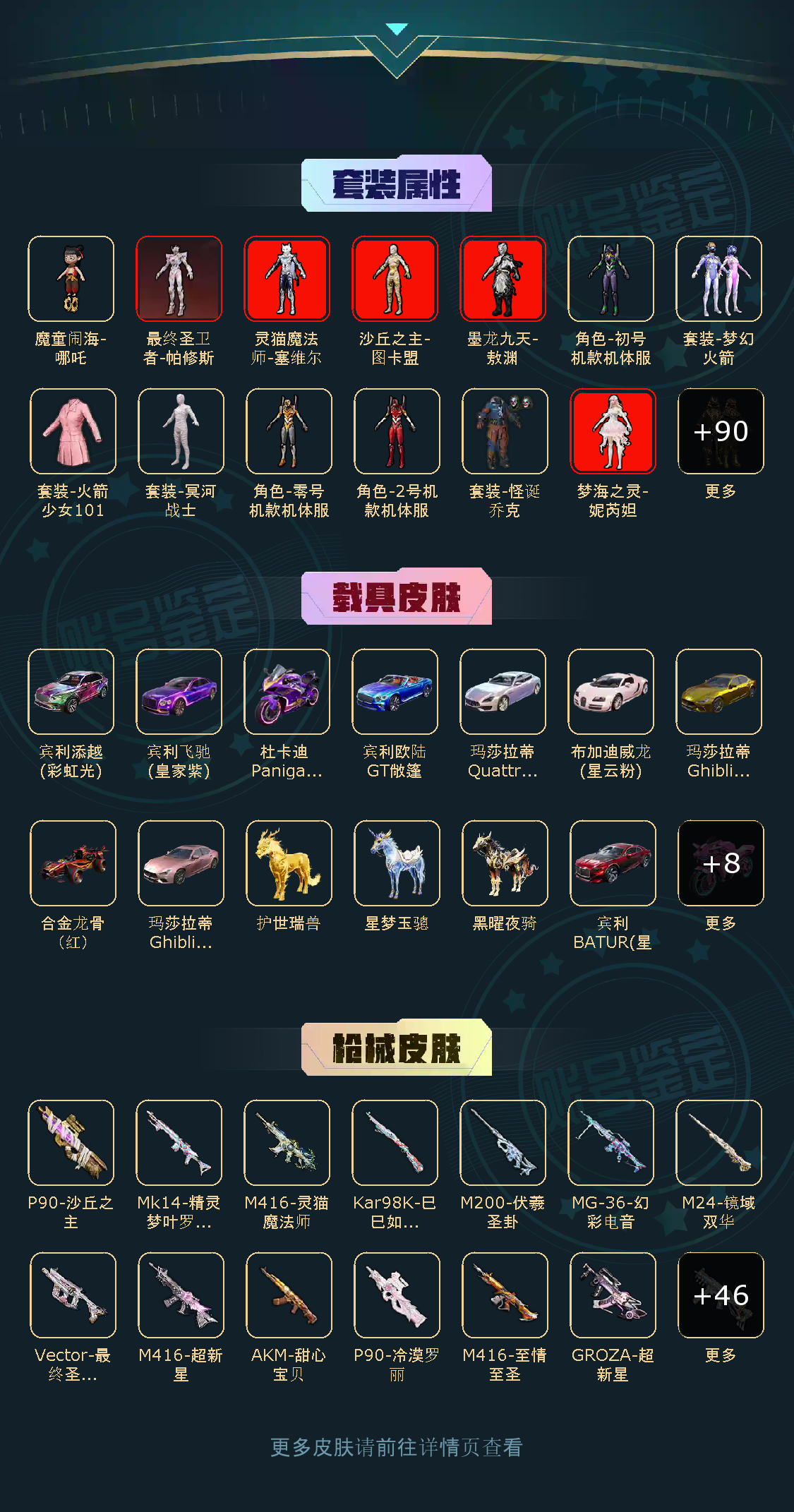 95粉,19载具,54特效枪,502套装,27王牌印记 UZI-绮梦青鸾AKM-甜心宝贝DP-28-扶摇飞仙SCAR-L-梦幻火箭SCAR-L-童趣迷兔Kar98K-伏魔团SKS-碧影闪光M416-风花雪月AUG-星之彼岸AWM-焰龙焚天M762-激战未来GROZA-香水柠檬M416-心之恋语平底锅-林间仙鹿M16A4-葫芦兄弟M416-五爪金龙DP-28-枪炮玫瑰AKM-炫紫旋律MG3-洛神天依S12K-海渊国主M762-甜蜜誓约UMP45-相思残雪M24-星之信仰M249-蓝莓炮弹玛莎拉蒂Ghibli(金)双人摩托-梦幻火箭鬼马风驰合金龙骨(红)玛莎拉蒂Ghibli(粉)快艇-塞莎KL27(鲸之蓝)