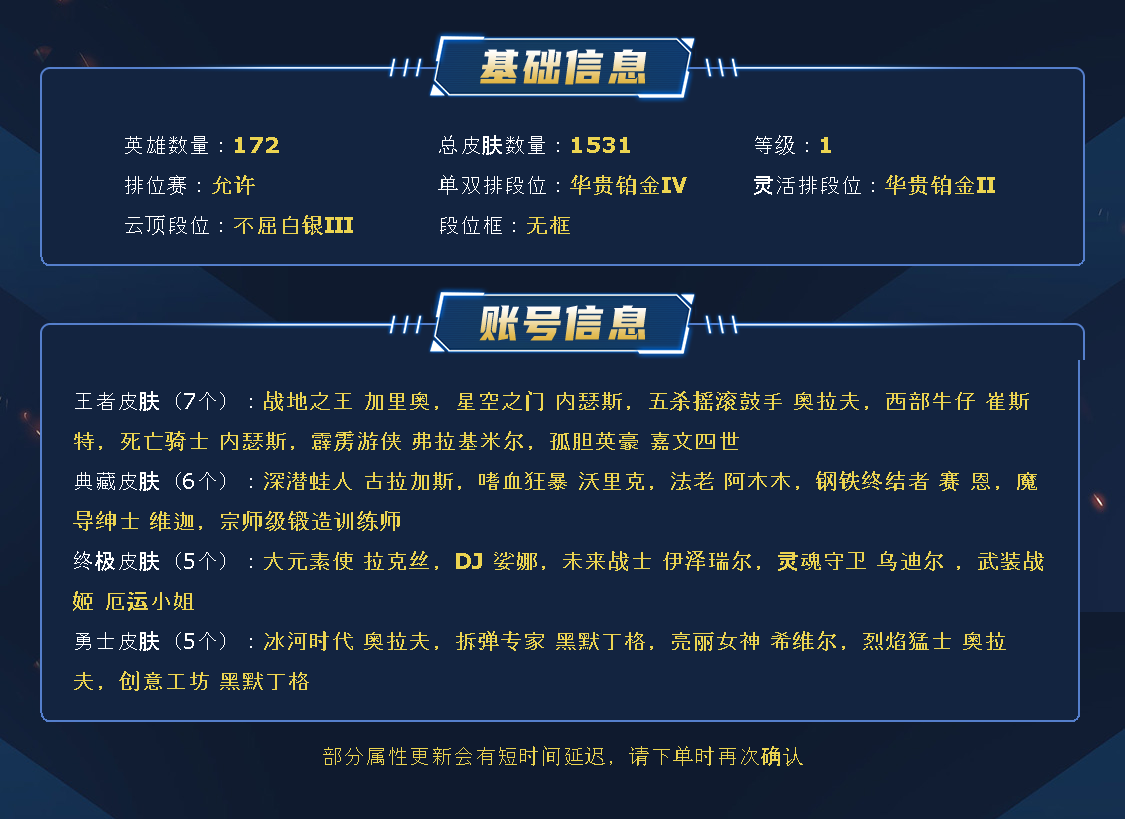 希望各位兄弟珍惜爱护此号,素质游戏,大家千万不要挂机逃跑,当成自己号来玩,输成什么样号主都能接受,如果故意逃跑或挂机肯定拉黑!【重要皮肤】女帝黛安娜至臻 KDA阿狸至臻 KDA阿狸2022至臻 战斗学院拉克丝至臻 战斗学院拉克丝2022至臻 电玩女神凯特琳至臻 电玩女神凯特琳2022至臻 绒毛菲兹至臻 绒毛菲兹2022至臻 腥红之月亚托克斯至臻 腥红之月亚托克斯2022至臻 未来战士锤石至臻 未来战士锤石2022至臻 黑夜使者李青至臻 黑夜使者李青2022至臻 海克斯科技安妮 海克斯科技玛尔扎哈 海克斯科技波比 海克斯科技嘉文四世 海克斯科技阿利斯塔 新卧虎藏龙贾克斯 暗星科加斯 黎明使者卡尔玛 恐惧新星德莱厄斯 摄魂使者薇恩 青年瑞兹 舞会公主安妮 战熊骑士瑟庄妮 创星之灵璐璐 钢铁军团拉克丝 庆典女皇艾尼维亚 暗星卡尔玛 黑夜使者弗拉基米尔 安妮梦游仙境 勇敢的心德莱厄斯 电玩女神厄运小姐 电玩勇者锐雯 电玩女神阿狸 龙的传人李青 银龙裁决泰隆 替父从军花木兰 神龙烈焰金克丝 碧玉之牙卡西奥佩娅 春晖神女拉克丝 你看见过我的熊猫吗安妮 北辰之威内瑟斯 南天之怒沃里克 美猴王孙悟空 定海神珍孙悟空 玉净夜叉凯特琳 紫金罗刹莫甘娜 广寒仙子嫦娥 虎痴之拳蔚 张辽文远 司马懿仲达 纳财大帝塔姆 醒狮克格莫 神龙之翼库奇 胜利女神奥莉安娜 胜利之剑亚托克斯 幽梦玫瑰伊莉丝 碎心之拳蔚 甜心之羽霞 甜心之翎洛 甜心宝贝安妮 甜心宝贝娑娜 穿心之剑菲奥娜 觅心游侠卢锡安 觅心魔灵奥莉安娜 觅心女王艾希 觅心之翼奎因 觅心猎手薇恩 冬境仙灵索拉卡 寒冬精灵璐璐 冬季仙境奥莉安娜 雪球也能爆炸吉格斯 圣诞捣蛋鬼金克丝 圣诞老人布隆 圣诞老人德莱文 冰雪驯鹿波比 冰雪风暴希维尔 冬季仙境卡尔玛 持胡萝卜的雪人易 狂心冰王图奇 冰封王子蒙多 冰雪女神辛德拉 魄罗骑士瑟庄妮 夺命美人卡特琳娜 平安夜女神娑娜 圣诞糖果棒厄运小姐 魅惑女巫迦娜 魅惑女巫莫甘娜 魅惑女巫崔丝塔娜 魅惑女巫奈德丽 死亡誓约卡特琳娜 灵魂收割者索拉卡 克烈古拉伯爵 泳池派对凯特琳 泳池派对普朗克 泳池派对奥莉安娜 泳池派对塔莉垭 泳池派对厄运小姐 泳池派对塔里克 泳池派对菲奥娜 泳池派对格雷福斯 泳池派对李青 泳池派对蕾欧娜 泳池派对雷克顿 电玩战魂赫卡里姆 斩星魔剑易 穿星魔锋赵信 御星魔矢艾希 鸡里奥 克格汪 制胜金靴李青 制胜金球拉莫斯 SSG霞 SSG洛 SSG纳尔 SSG塔莉垭 SSG嘉文四世 SSG伊泽瑞尔 SKTT1扎克 SKTT1烬 SKTT1辛德拉 SKTT1娜美 SKTT1艾克 SKTT1奥拉夫 SKTT1阿利斯塔 SKTT1卡莉丝塔 SKTT1瑞兹 SKTT1阿兹尔 SKTT1伊莉丝 SKTT1雷克顿 SSW锤石 SSW雷恩加尔 SSW泰隆 SSW图奇 SSW辛吉德 SKTT1贾克斯 SKTT1劫 SKTT1婕拉 SKTT1李青 SKTT1薇恩 暗杀星奥莉安娜 暗杀星蒙多 暗杀星努努和威朗普 暗杀星伊泽瑞尔 暗杀星慎 Fnatic迦娜 Fnatic库奇 Fnatic古拉加斯 Fnatic嘉文四世 Fnatic卡尔萨斯 冰雪节格雷福斯 冰雪节玛尔扎哈 冰雪节辛吉德 冰雪兽纳尔 防暴机器人布里茨 防暴士兵格雷福斯 防暴士兵辛吉德 防暴天使凯尔 钢铁之翼艾尼维亚 冠军典狱长锤石 冠军掠夺者卡兹克 冠军之矛卡莉丝塔 冠军之刃锐雯2016 冠军之血希瓦娜 冠军之隐劫 春晖神女艾希 鬼影森森茂凯 鬼影重重魔腾 海贼瑞兹 胡桃夹子萨科 惊悚派对阿木木 惊悚派对费德提克 警用试作体K9内瑟斯 蓝色忧郁崔斯特 密林猎手提莫 南瓜头费德提克 女猎手希维尔 破空枪骑孙悟空 圣诞精灵崔丝塔娜 圣诞开心鬼提莫 圣诞狂欢基兰 圣诞狂欢努努和威朗普 圣诞老人古拉加斯 圣诞玩偶波比 圣诞驯鹿克格莫 糖果使徒费德提克 外星装甲库奇 卧虎藏龙贾克斯 无头骑士赫卡里姆 喜庆之树茂凯 邪恶圣诞老人维迦 幸福女神乐芙兰 雪默丁格 雪装奈德丽 野兽猎人德莱文 野兽猎人瑟庄妮 野兽猎人泰达米尔 英勇玩具兵普朗克 永恒之森乐芙兰 勇者阿狸 勇者奈德丽 征服者卡尔玛 征服者韦鲁斯 暗影沃里克 机械迷城加里奥 战场BOSS吉格斯 阿木木主人不要我了 波比的巧克力工坊 地底世界崔斯特 都铎王朝图奇 十周年纪念安妮 源代码乐芙兰 斗魂觉醒佛耶戈 DJ娑娜 大元素使拉克丝 灵魂守卫乌迪尔 未来战士伊泽瑞尔 武装战姬厄运小姐