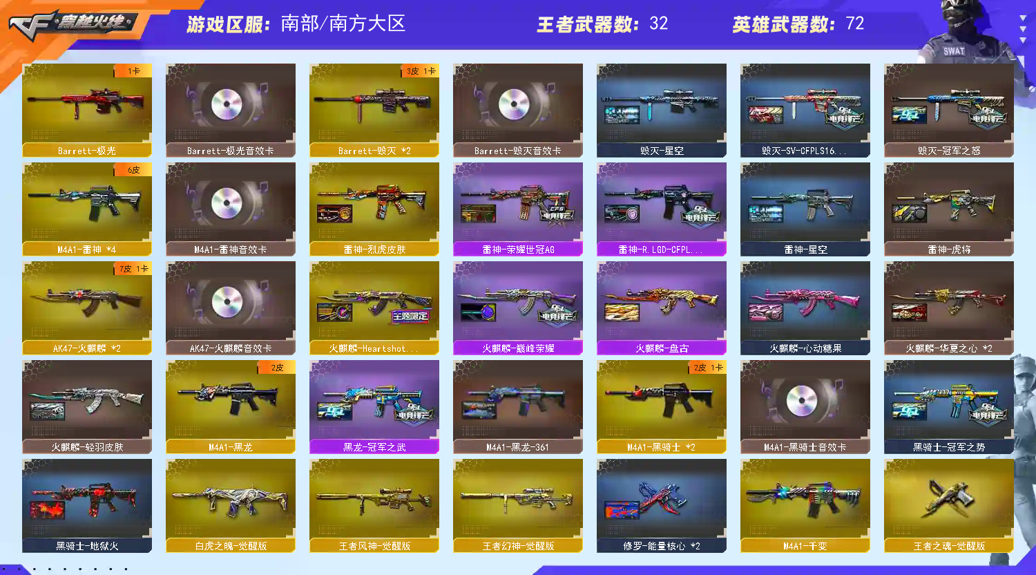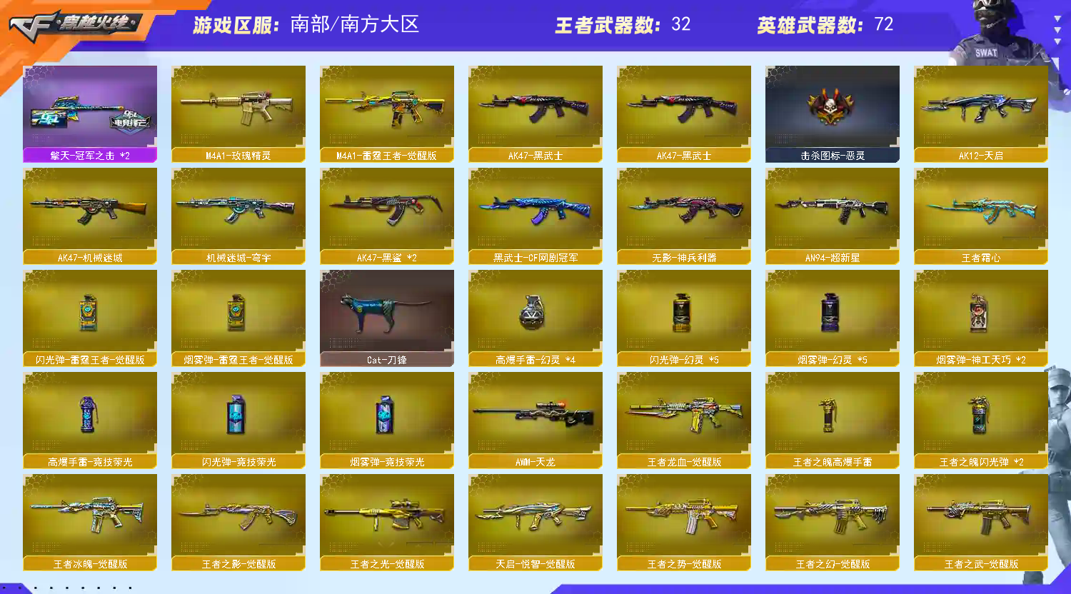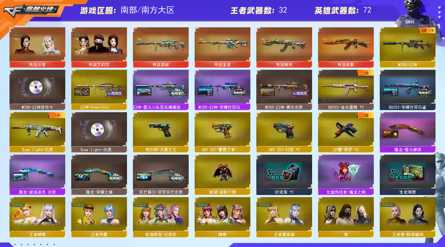 【主 武】:传说辉光、传说夜影、传说圣灵、传说灵眸、幻神(火星小队、女团、白鲨、黄忠)、王者幻神、王者风神、白虎、白虎之魄、王者风铭、千变、火麒麟X2(巅峰荣耀、枪娘、女团、华夏之心)、黑龙(冠军之武)、雷神X4(AG、女团、星空、耀金)、黑骑士X2(冠军之势)、黑武士、天启、超新星、机械迷城、黑鲨X2、天龙、毁灭X2(冠军之怒、SV、枪娘)、极光、巨龙咆哮3、征服者、等各种活动武器