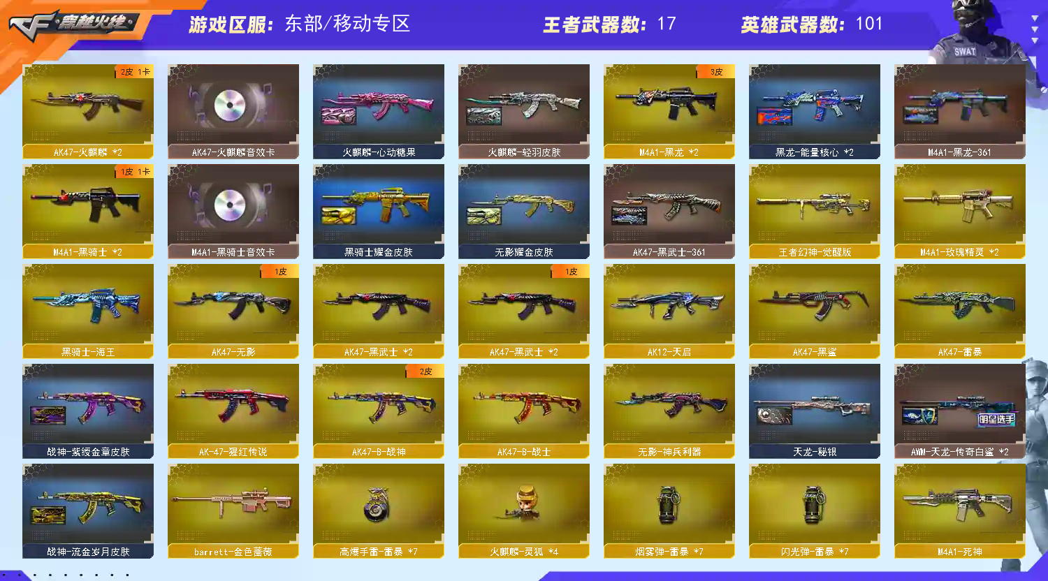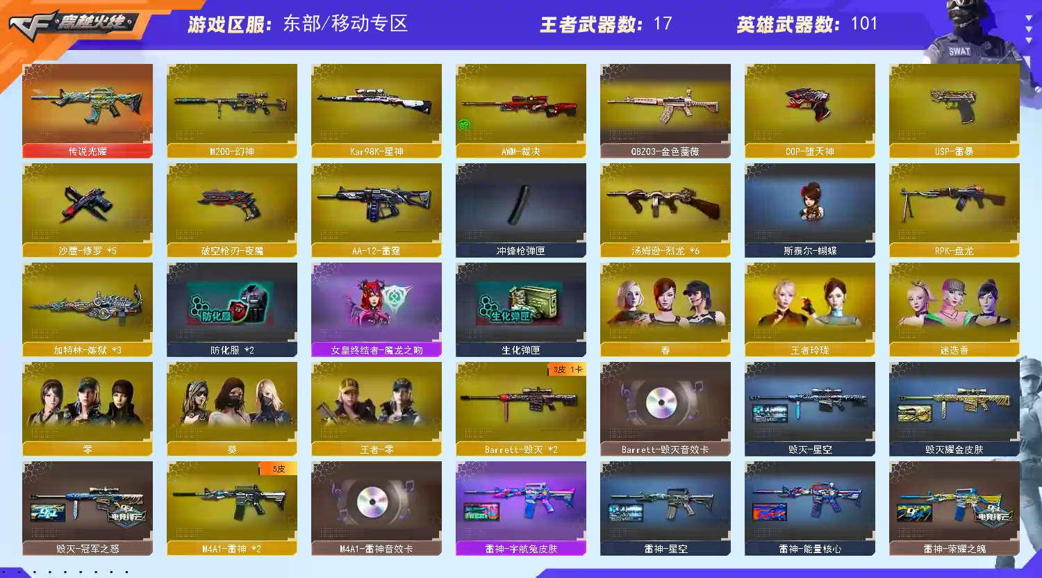 稀有武器:传说光耀/M200幻神/98K星神/王者幻神/盘龙+3把炼狱/6烈龙斯泰尔蝴蝶/QBZ金色蔷薇/Barrett金色蔷薇/AWM裁决/USP雷暴/COP堕天神/破空枪刃夜魔/修罗古蛇迷踪
