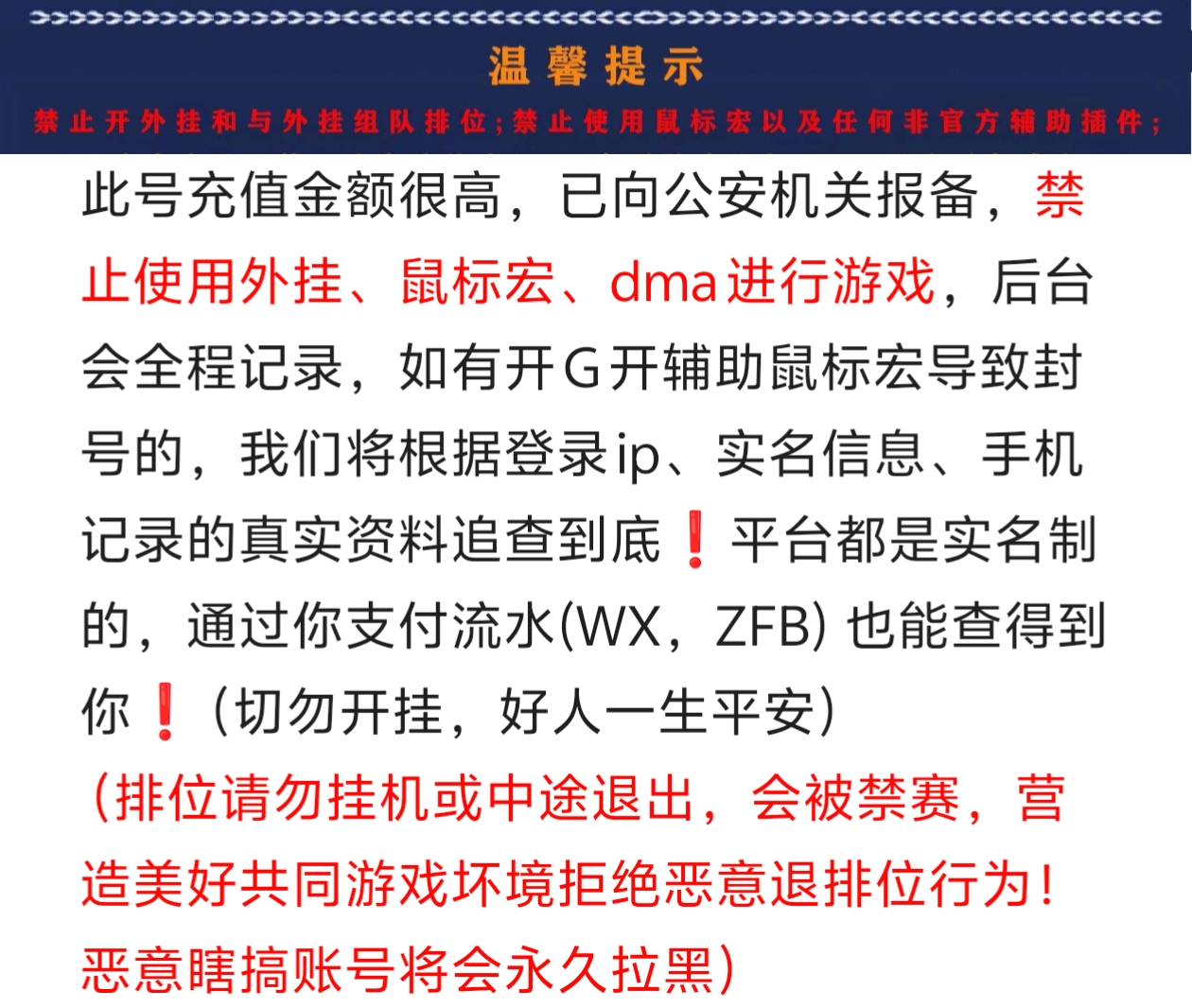 此号充值金额很高,已向公安机关报备,禁止使用外挂、鼠标宏、dma进行游戏,后台会全程记录,如有开G开辅助鼠标宏导致封号的,我们将根据登录ip、实名信息、手机记录的真实资料追查到底❗️平台都是实名制的,通过你支付流水(WX,ZFB) 也能查得到你❗️(切勿开挂,好人一生平安)