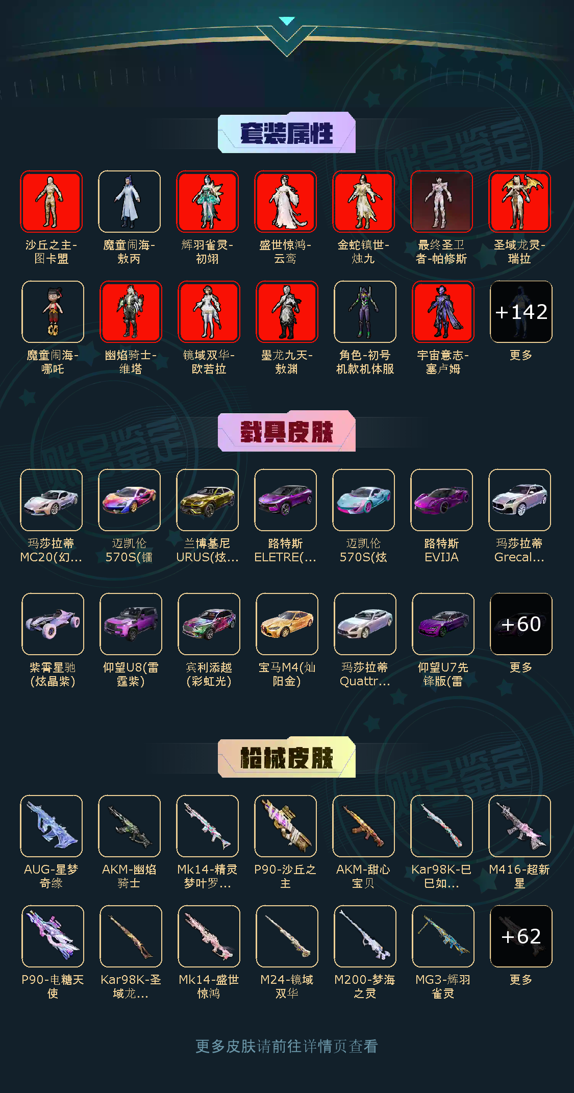 总套装611枪械总数量610粉装数量128载具数量70🚗特效枪61超高王牌印记31🈵绝世
