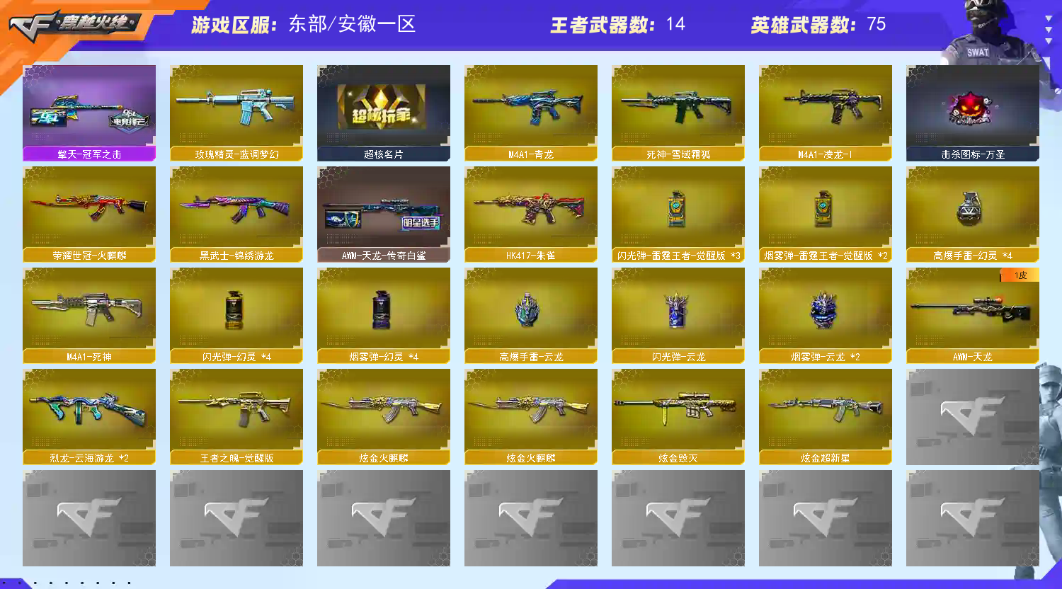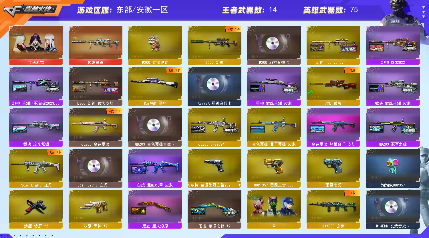 【安徽一区-安徽】 70V14王者3炫金VIP4【主武器类型】 传说灵眸 M200-幻神 Kar98K-星神 QBZ03-云龙 荣耀世冠-火麒麟 Scar-白虎 ScarLight-马枪 M14EBR-玄武 王者之怒觉醒版 Barrett-毁灭 *2 AWM-裁决 王者之魄觉醒版 M4A1-雷神 *2 QBZ03-金色蔷薇 M4A1-黑龙 M4A1-黑骑士 *2 死神-雪域霜狐 M4A1-死神 M4A1-青龙 AK47-火麒麟 *3 无影-波塞冬 黑武士-锦绣游龙 超新星-热带奇洋 汤姆逊-烈龙 烈龙-云海游龙 *2 M4A1-凌龙-I 炫金火麒麟 炫金毁灭 白虎-迷你小艾 MK5-炽火炎龙 炫金超新星 AK47-B十周年 黄金AK 烟雾弹-荣耀世冠白鲨2023 高爆手雷-云龙 闪光弹-云龙 烟雾弹-云龙 *2 闪光弹雷霆王者觉醒版 *3 烟雾弹雷霆王者觉醒版 *2 高爆手雷幻灵 *4 闪光弹幻灵 *4 烟雾弹幻灵 *4 手雷-云海游龙 手雷-热带奇洋 【王者武器】 高爆手雷雷霆王者 *2 【副武器类型】 柯尔特-荣耀世冠白鲨2023 *2 COP-雷霆王者觉醒版 COP-雷霆 COP白鲨 真的是手枪 COP-旗袍 沙鹰-修罗 *2 修罗-古蛇迷踪 沙鹰-天神 *2 天神-波塞冬 Colt1911小故障 Cfcolt1911大黄蜂 【近身武器类型】 云龙扇 *2 屠龙 幻灵之锋 雷霆王者之锋觉醒版 荣耀世冠-龙啸 龙啸-热带奇洋 麒麟刺 擎天 *5 擎天-云海游龙 猫猫手套 萌萌海滩皮球汪 龙啸-烈火龙威 【稀有角色】 传说影煞 王者潘多拉 隼 灵狐者-职业经理 晴雅 王者炫 雾萌萌 灵动武士 奇洋探员 云海玲珑 零热舞青春 0号玩家 潘多拉X 影武者X 复仇者 闪光护目镜 超级对讲机 超级背包 【武器皮肤及道具】 幻神音效卡 幻神-荣耀世冠白鲨2023 幻神-Heartshot 幻神-CFS2022 M200-幻神-黄忠皮肤 星神-巅峰荣耀 白虎-霓虹机甲 QBZ03-冠军之薇 QBZ03-CFS2024 雷神-CFS十周年纪念版 雷神-刘备 M4A1-战神赵云 雷神-白鲨-CFPLS14冠军 雷神-源计划2.0 雷神耀金 火麒麟-轻羽 火麒麟-盘古 毁灭-SV-CFPLS16冠军 毁灭-墨兰 毁灭-战神张飞 毁灭-暗月 黑龙-冠军之武 黑龙-能量核心 裁决-流光秘银 AWM-天龙-传奇白鲨 修罗-CFSTAR 屠龙-星火燎原 屠龙-荣耀之锋 擎天-冠军之击 麒麟刺-甜蜜糖果 星神音效卡 白虎音效卡 黑骑士音效卡 QBZ03-金色蔷薇音效卡 【稀有套装】