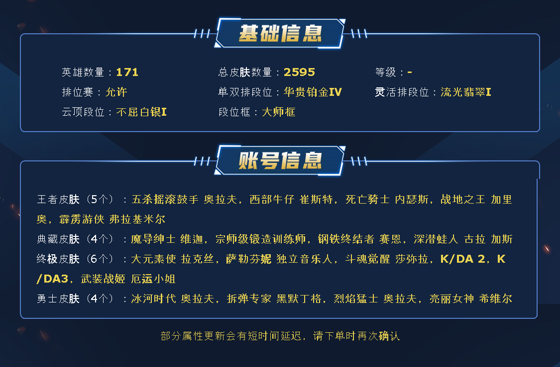 2500皮,92神话,签名版卡莎各种至臻,AD皮肤偏多,可打任何模式,请不要挂机!