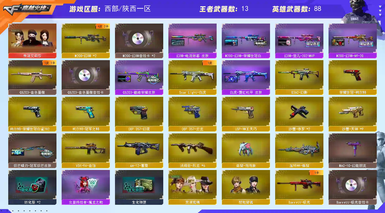 98V 4王者 幻神电流骇客 /幻神世冠白鲨/幻神N9/幻神宠儿/毁灭冠军之怒/毁灭星空/毁灭黑大圣/火麒麟CFSTAR/火麒麟华夏之心/火麒麟平天大圣/传说艾莉莎 荒漠琉璃/战地猎狐/M200-幻神(2)/Barrett-毁灭(2)/Barrett-极光/王者星神-觉醒版/M4A1-雷神/Barrett-极光音效卡/M200-幻神音效卡/M4A1-黑龙音效卡/QBZ03-金色蔷薇音效卡/M4A1-雷神音效卡
