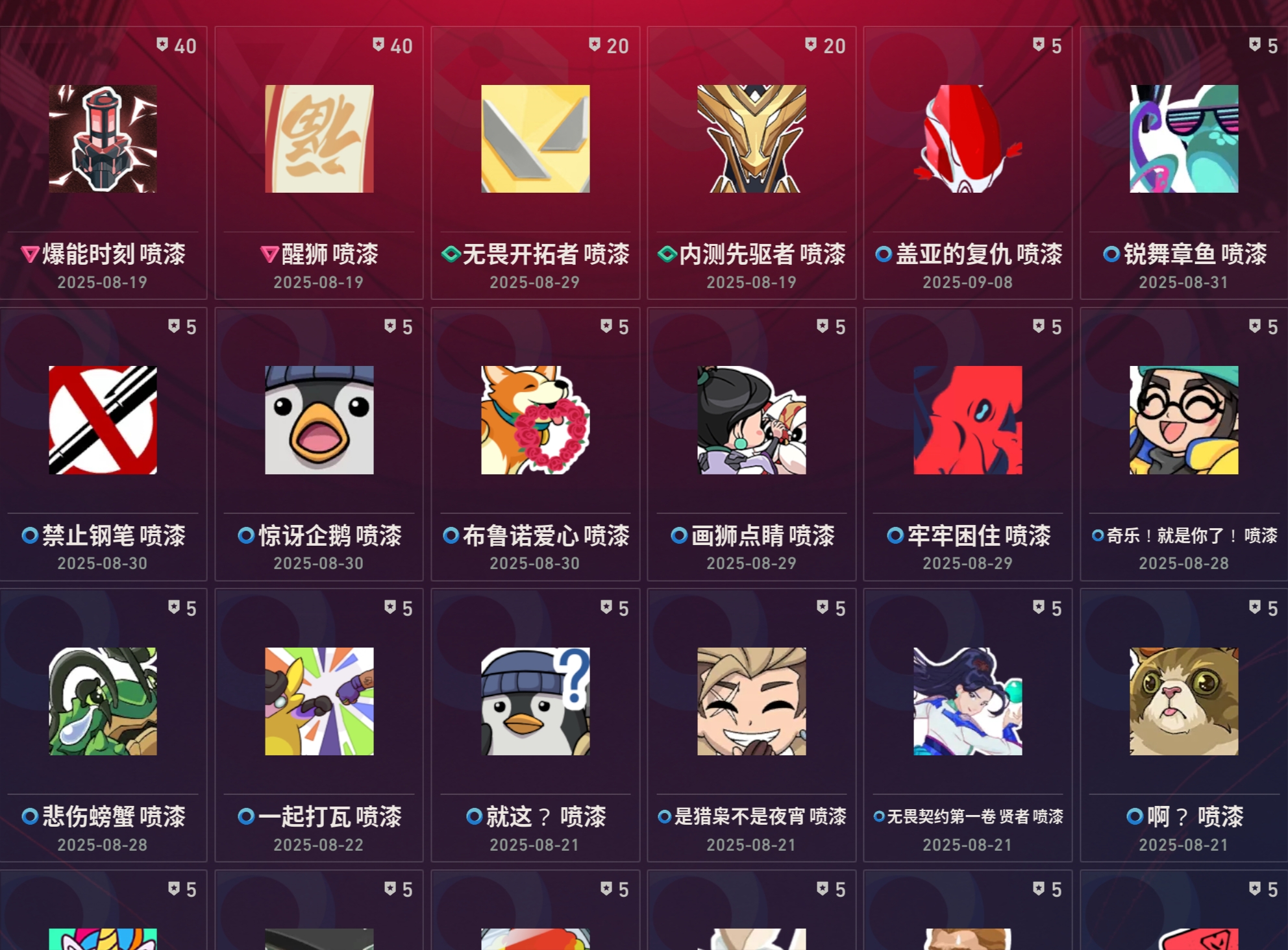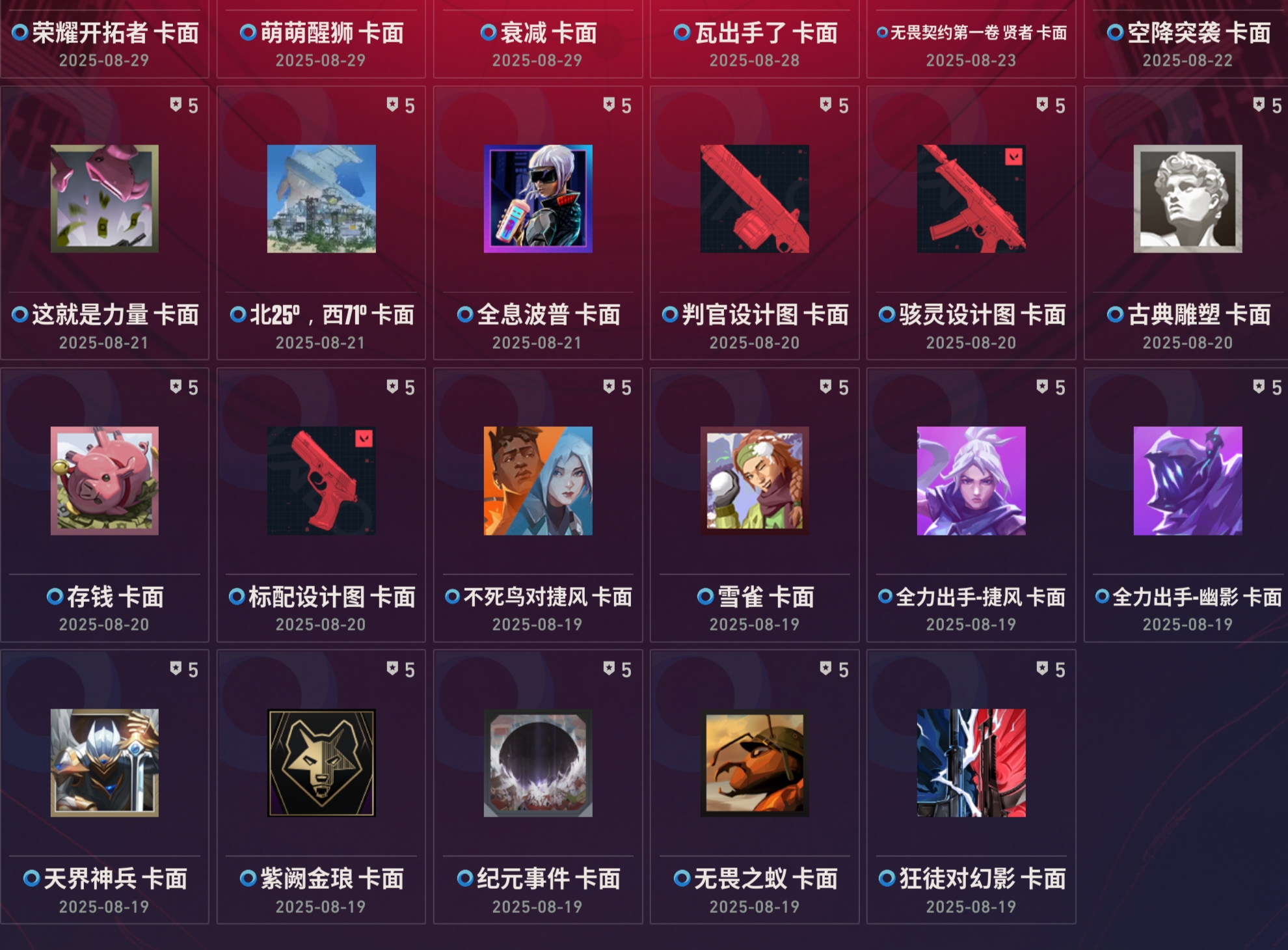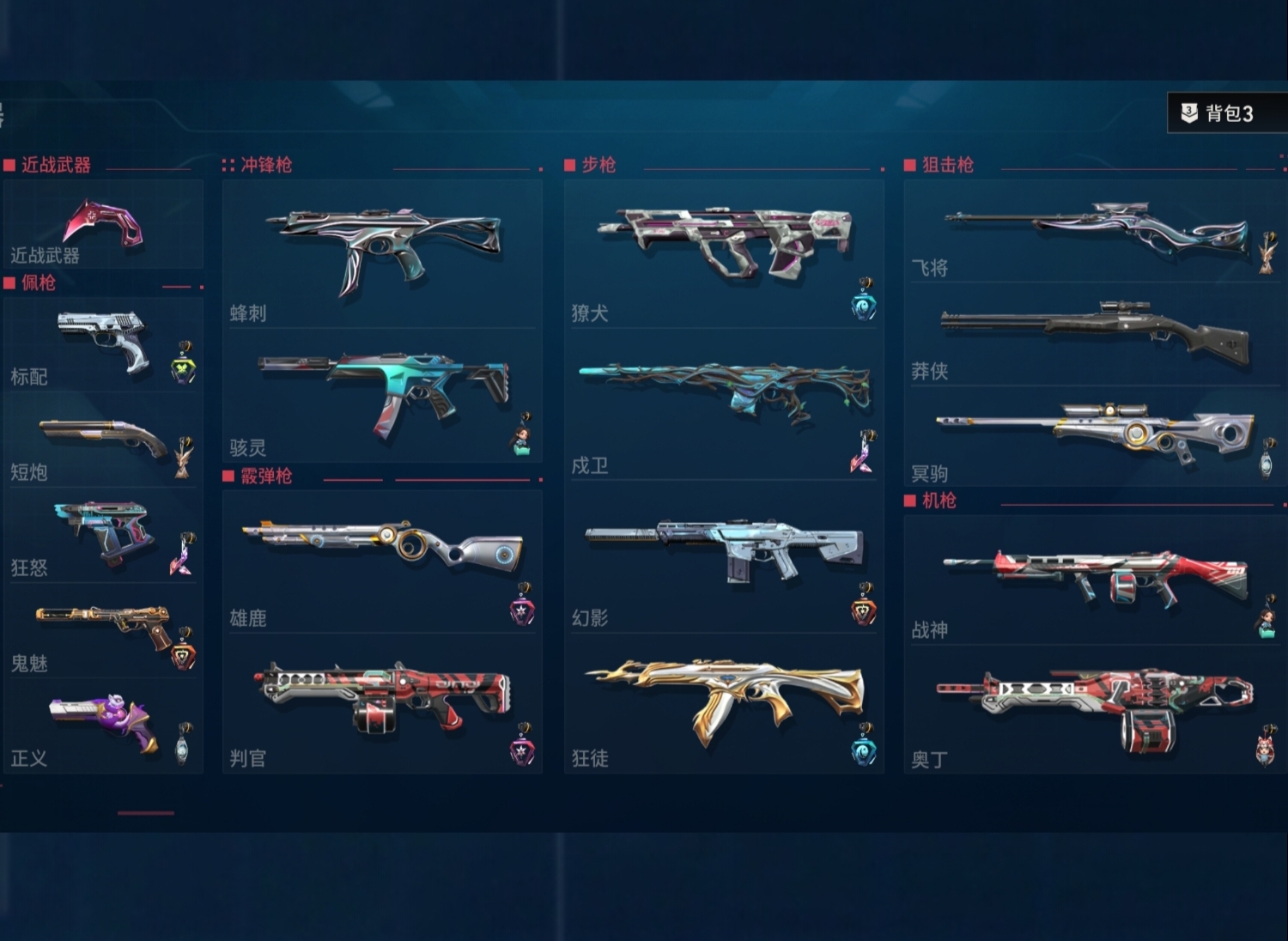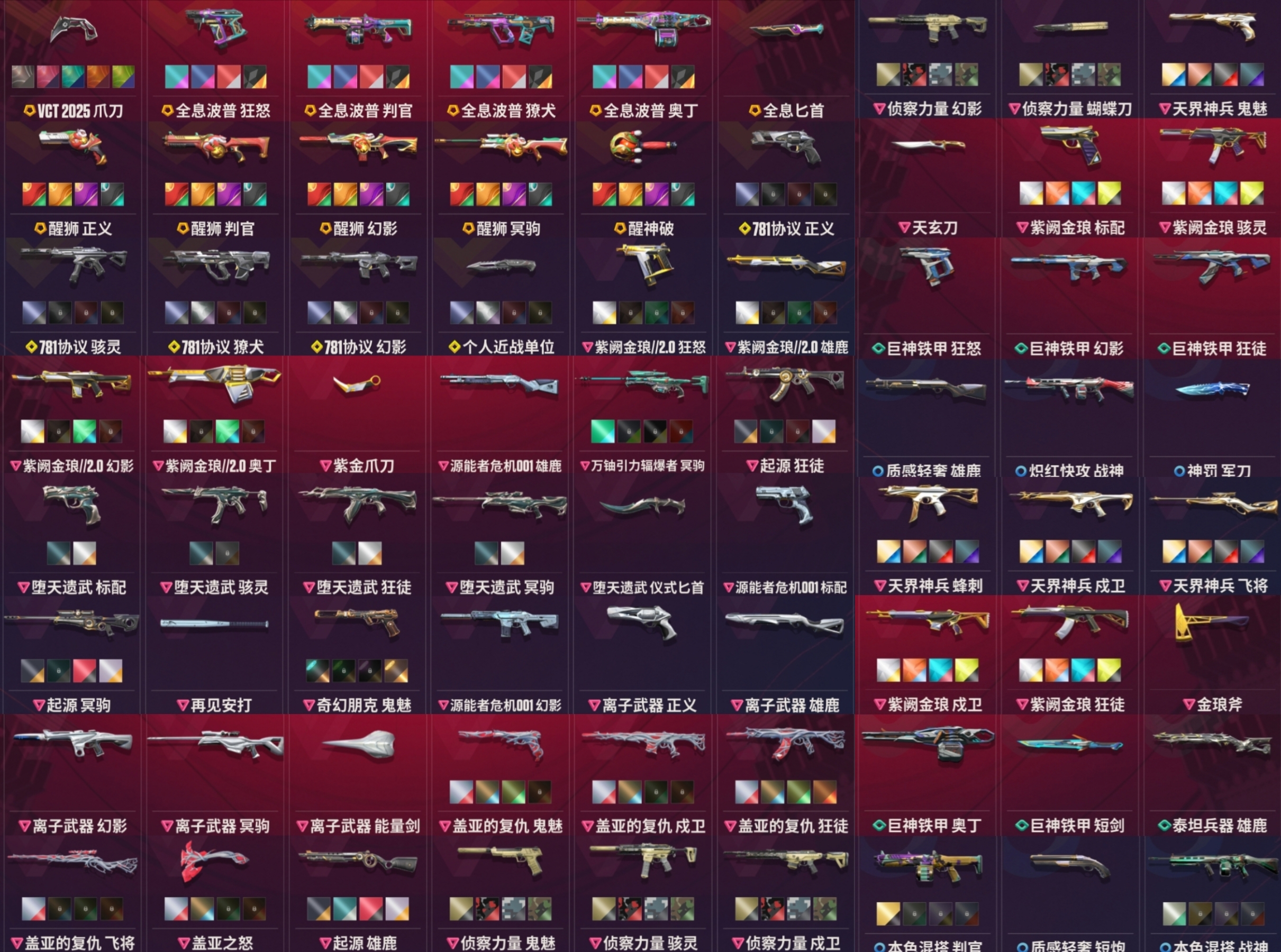 近战武器:vct2025爪刀满级全炫彩(vct爪刀)/紫金爪刀2级/澄湖涟滟2级鱼扇/沧澜戟2级深蓝/偃月2级/起源环刃2级/无畏契约第1卷苦无2级/辐爆之杖2级/推进模式前进四2级银蓝/堕天遗武仪式匕首2级/个人近战单位满级粉白/离子武器能量剑2级/盖亚之怒2级蓝色/全息匕首2级/醒神破2级全炫彩/天玄刀2级/侦察力量蝴蝶刀2级全炫彩(侦察蝴蝶刀)/金琅斧2级/再见安打/巨神铁甲短剑/神罚军刀(神中神)