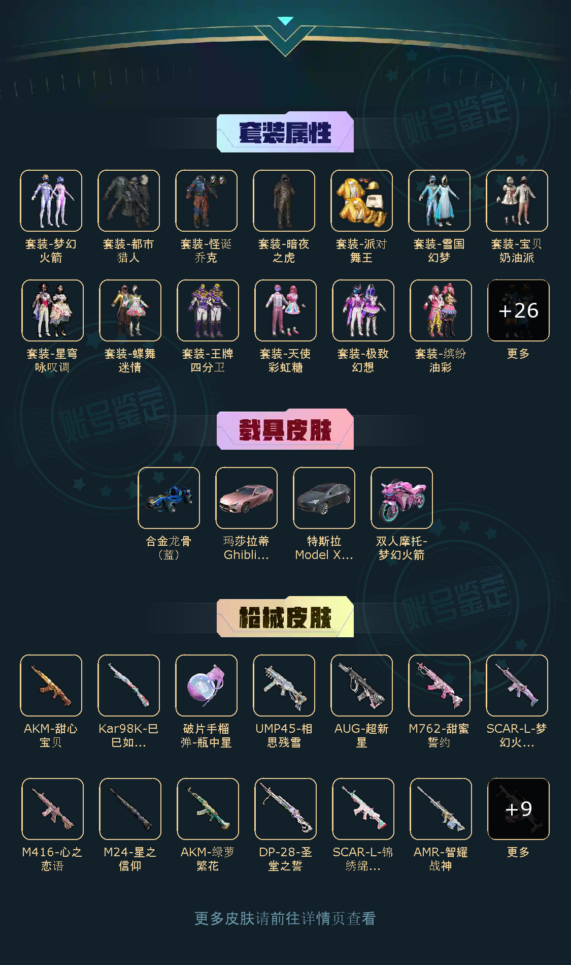 【稀有资产】套装-雪国幻梦/套装-怪诞乔克/套装-派对舞王/套装-寒蝎幽灵/套装-都市猎人/套装-奇异狩猎者/套装-暗夜魅影/套装-粉红小猪/套装-浪漫天命/套装-潮萌小黄鸭/套装-雪山精英/套装-暗影哥特/套装-龟仙人/套装-迅捷狂鲨/套装-浪漫波比/套装-暗夜之虎/玩偶服-卖崽青蛙/角色-都市丽猫/角色-摩登魅猫/套装-墨青刃影/套装-暗夜武装/套装-狂沙舞者/套装-狂战萌兔/套装-青涩年华/套装-萌萌史莱姆/套装-奇迹天团/角色-灵公主/套装-冷酷挑战者/M416-仓鼠灰灰/M416-快乐主宰