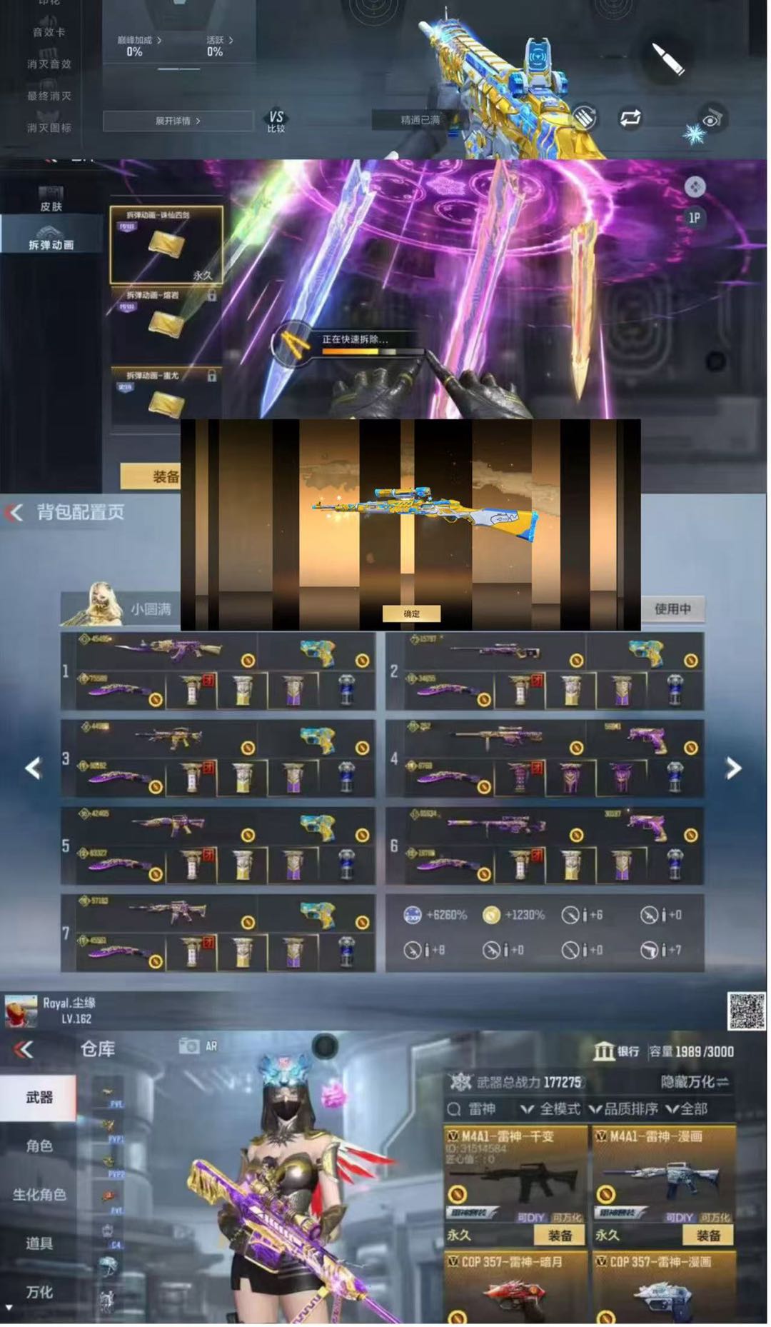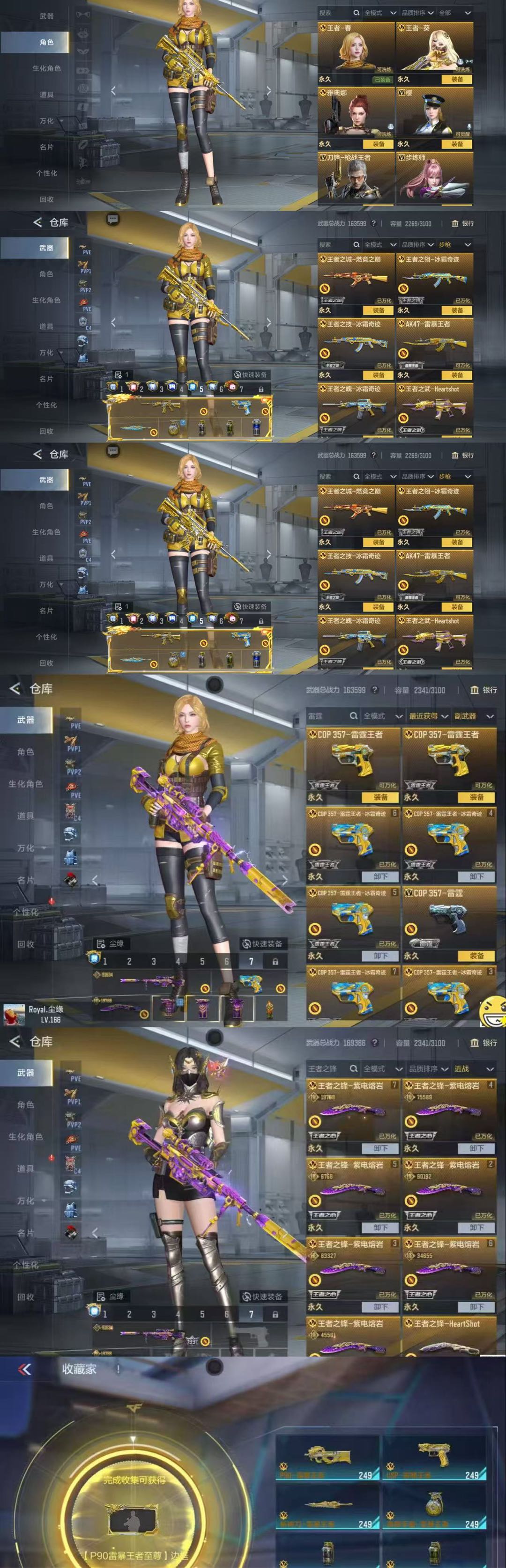 本游戏账号:英雄武器253个, 王者武器72个。军衔: 荣耀元首,段位: 枪皇S,拥有:云悠悠,樱,关小雨,等18个角色。装备齐全让你拥有完美游戏初体验,特殊装备有:王者之迹、巴雷特-毁灭、M4A1-雷神、地狱烈炎、死神闪光弹、AK47-无影、王者之翼闪光弹、王者之势烟雾弹、M4A1-黑龙、王者之电、AK47-变色龙、王者之翼烟雾弹、AK47-雷麒麟、王者之势手雷、QCW05-变形金刚·大黄蜂、燃烧弹-游骑兵、尼泊尔-竞界荣光、M4A1-星象、火麒麟烟雾弹、AWM-游骑兵、火麒麟闪光弹、AK47-孟德、AK47-奉先、VEPR12-本初、COP 357-雷霆、火麒麟手雷、黑骑士闪光弹、高爆手雷-雷霆王者、王者之影、MK23-幻神、铁锹-超新星、墨刃-幻神、王者之势、王者之武、王者之翼、KSG-孟获、烟雾弹-雷霆王者、MK47-仁德、王者之势闪光弹、81式-光明之神、闪光弹-雷霆王者、王者之掣、M200-幻神、AK47-雷霆王者、王者之锋、尼泊尔-火麒麟、王者之刺、王者之心手雷、王