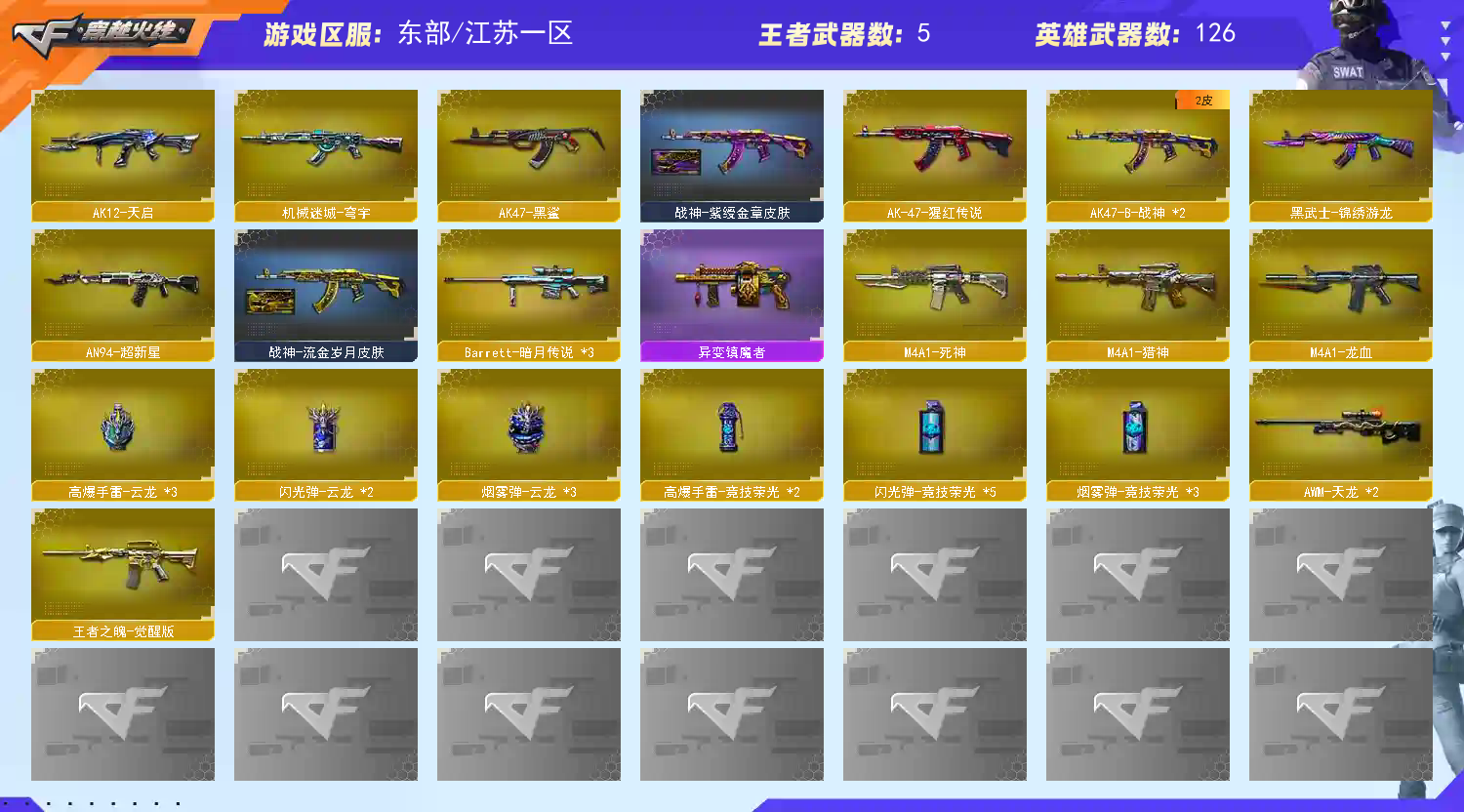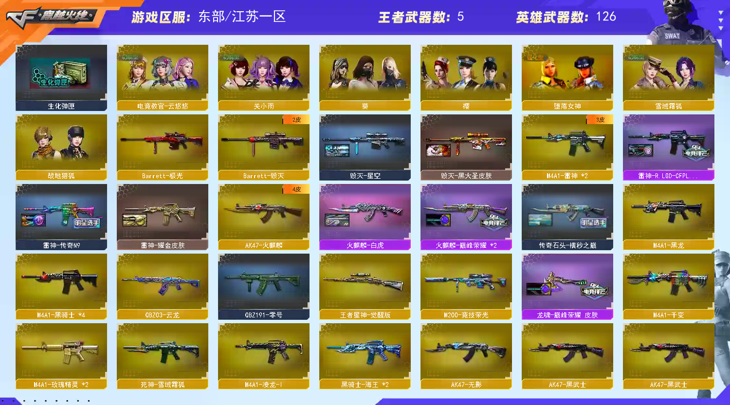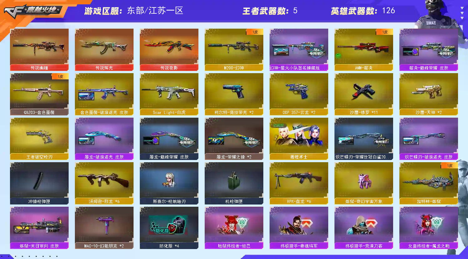 【江苏一区】【可二次实名】【可排位】【新锐1】【等级VIP4】【V武器数132】【幻神1皮】【6烈龙】【斯泰尔-枪娘暗刃】【6盘龙】【竞技荣光套装X2套】【云龙套装X3套】【传说幽瞳】【传说辉光】【传说夜影】【M200-幻神】【幻神-星火小队签名臻藏版 皮肤】【M200-竞技荣光】【星神-枪娘默 皮肤】【王者星神-觉醒版】【AWM-裁决】【Scar Light-白虎】【QBZ03-金色蔷薇】【金色蔷薇-破浪逐光 皮肤】【QBZ03-云龙】【QBZ191-银翼游侠】【柯尔特-竞技荣光】【COP 357-云龙】【炽芒蝶刃】【炽芒蝶刃-荣耀世冠白鲨2023 皮肤】【炽芒蝶刃-破浪逐光 皮肤】【Knife-冠军之刃】【黄金猫猫手套-白鲨】【电竞教官-云悠悠】【毒蝰术士】【关小雨】【葵】【奇洋探员】【乔伊教练】【蛇隐宗】【樱】【云海玲珑】